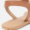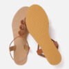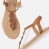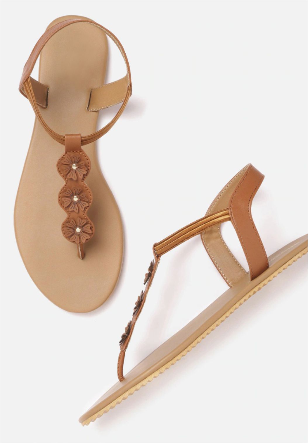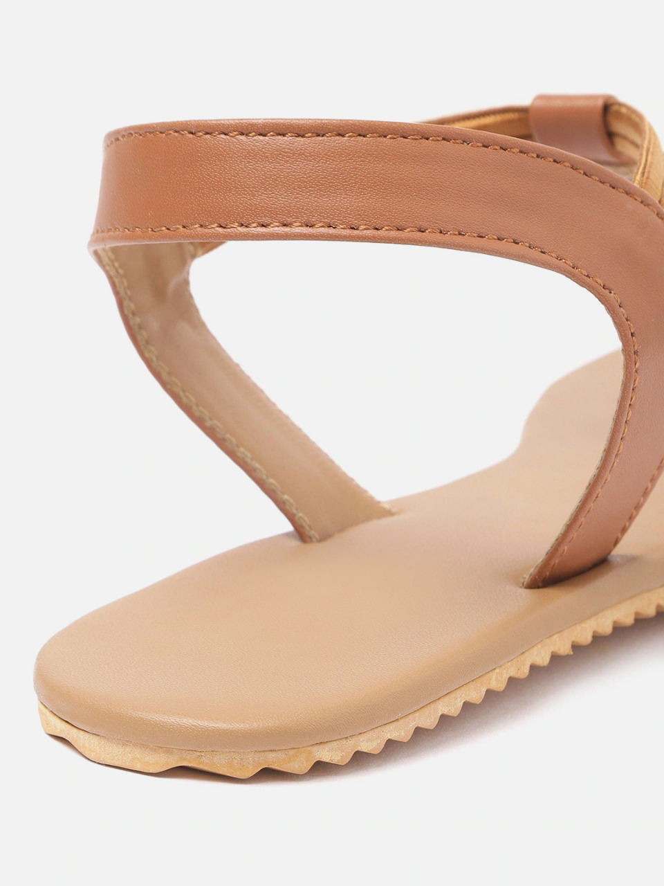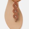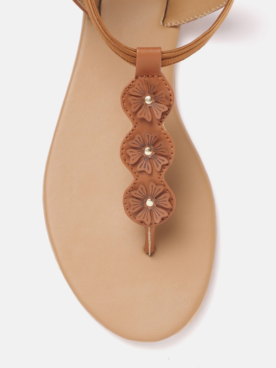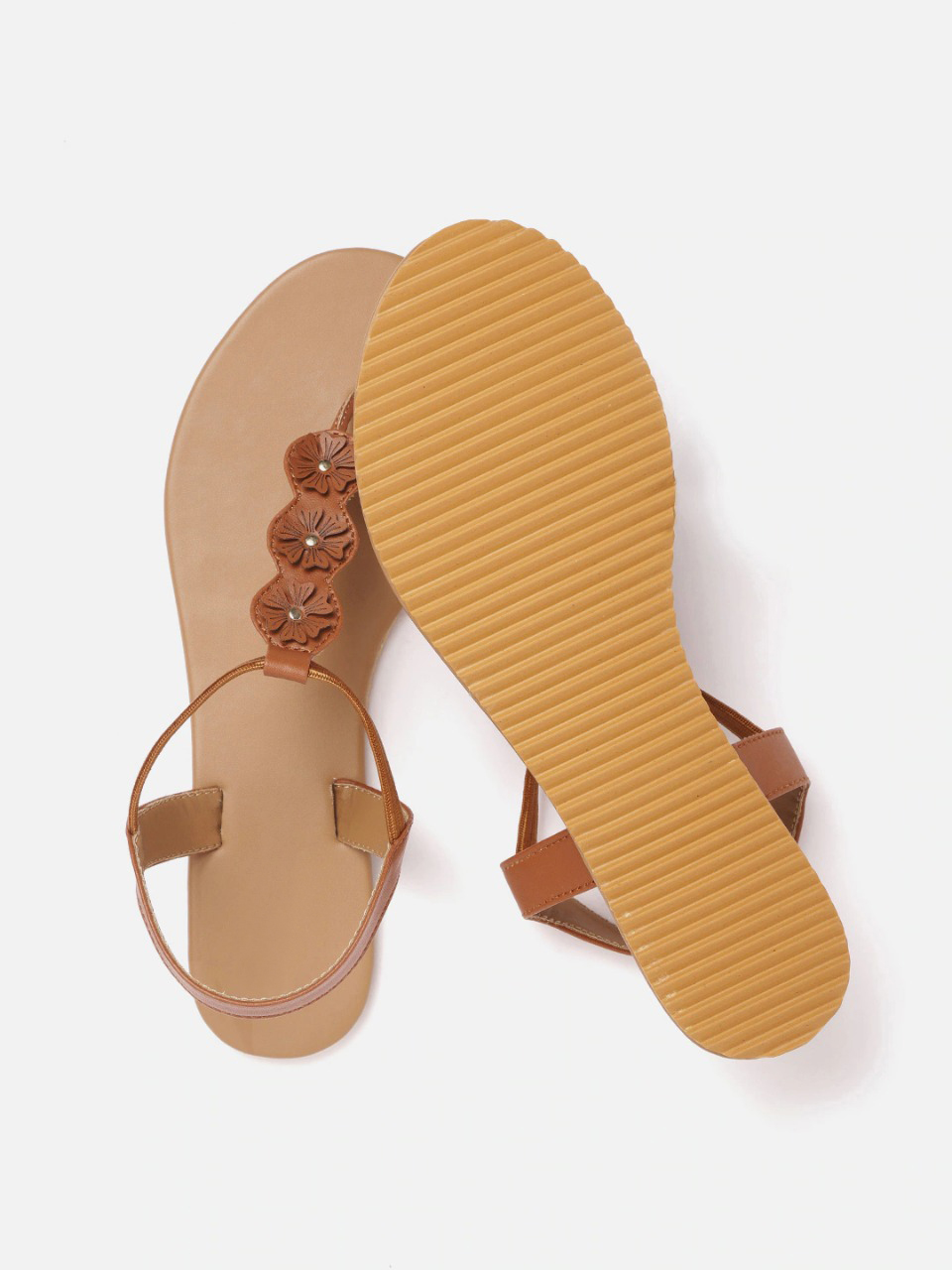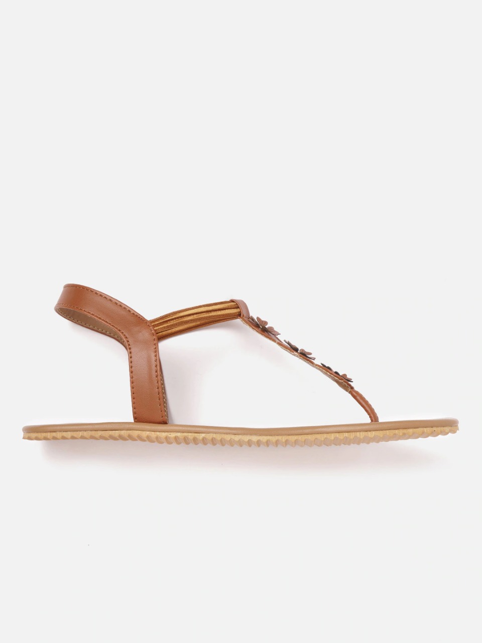 A pair of tan brown applique detail T-strap open-toed flats, has regular styling, backstrap detail