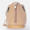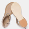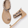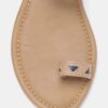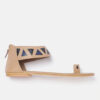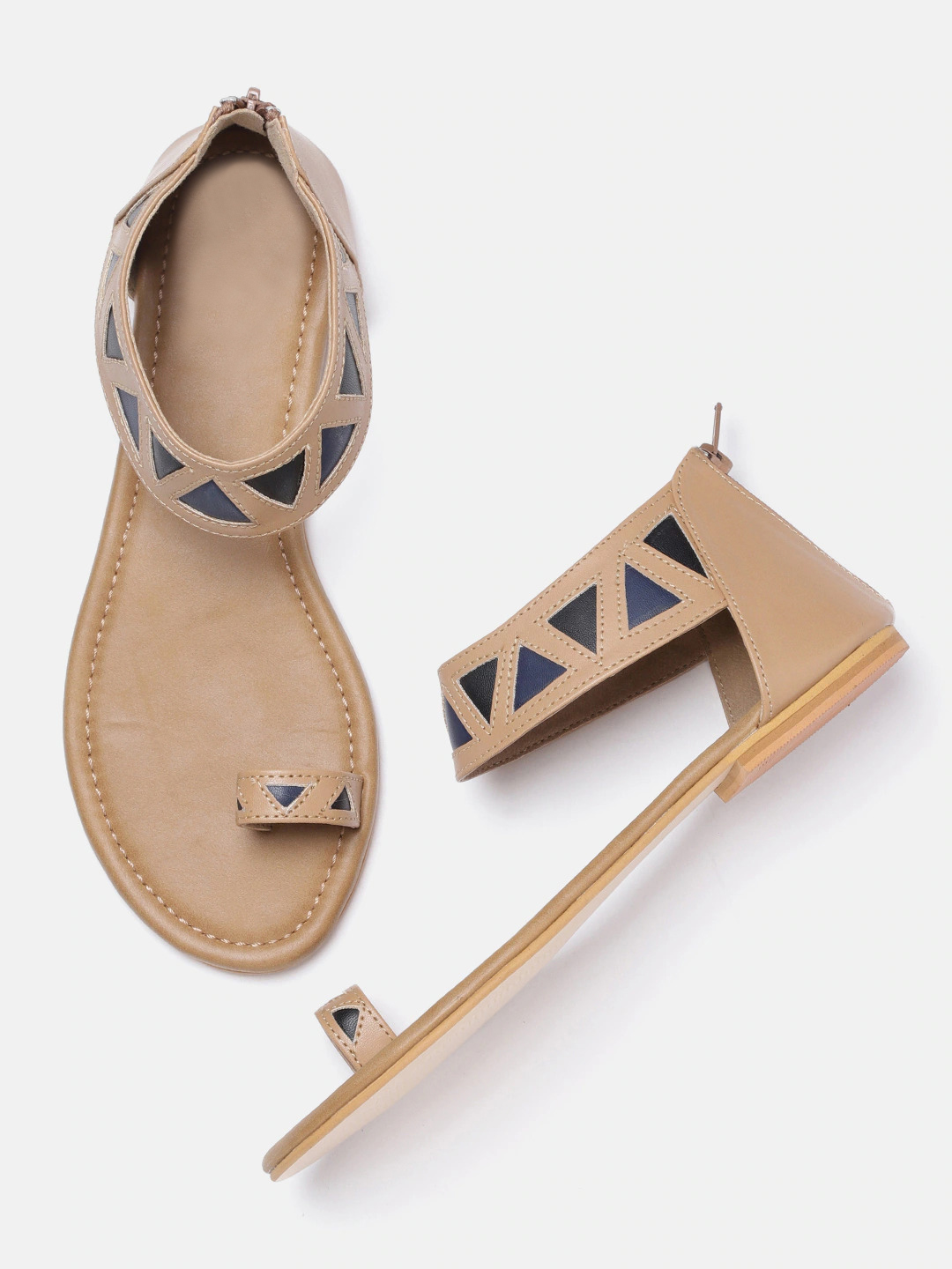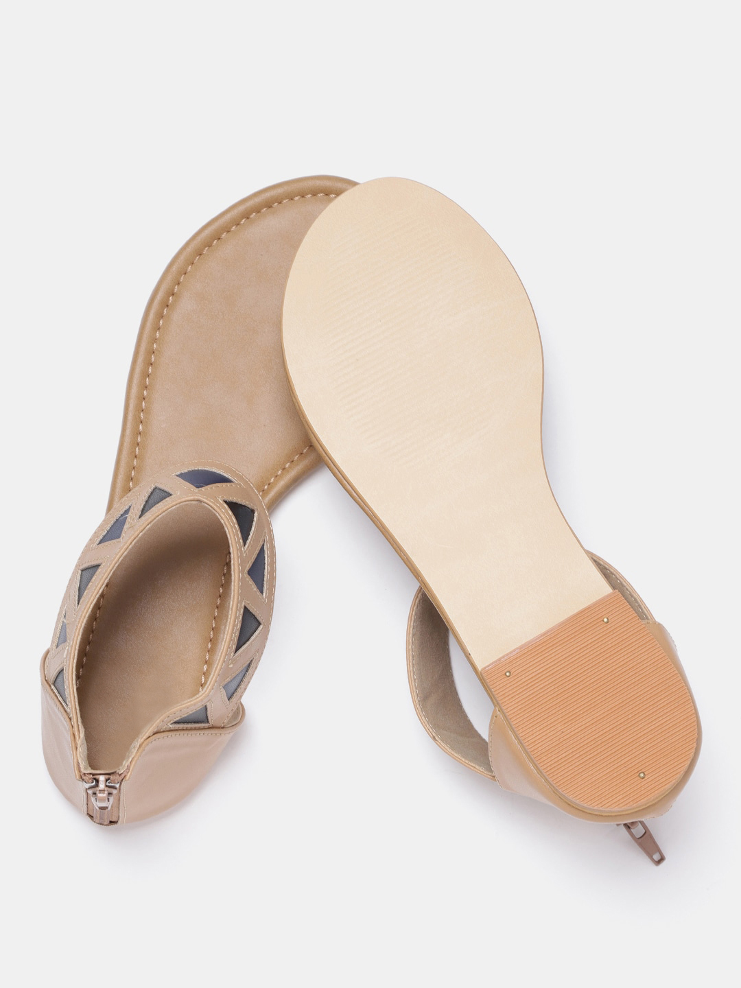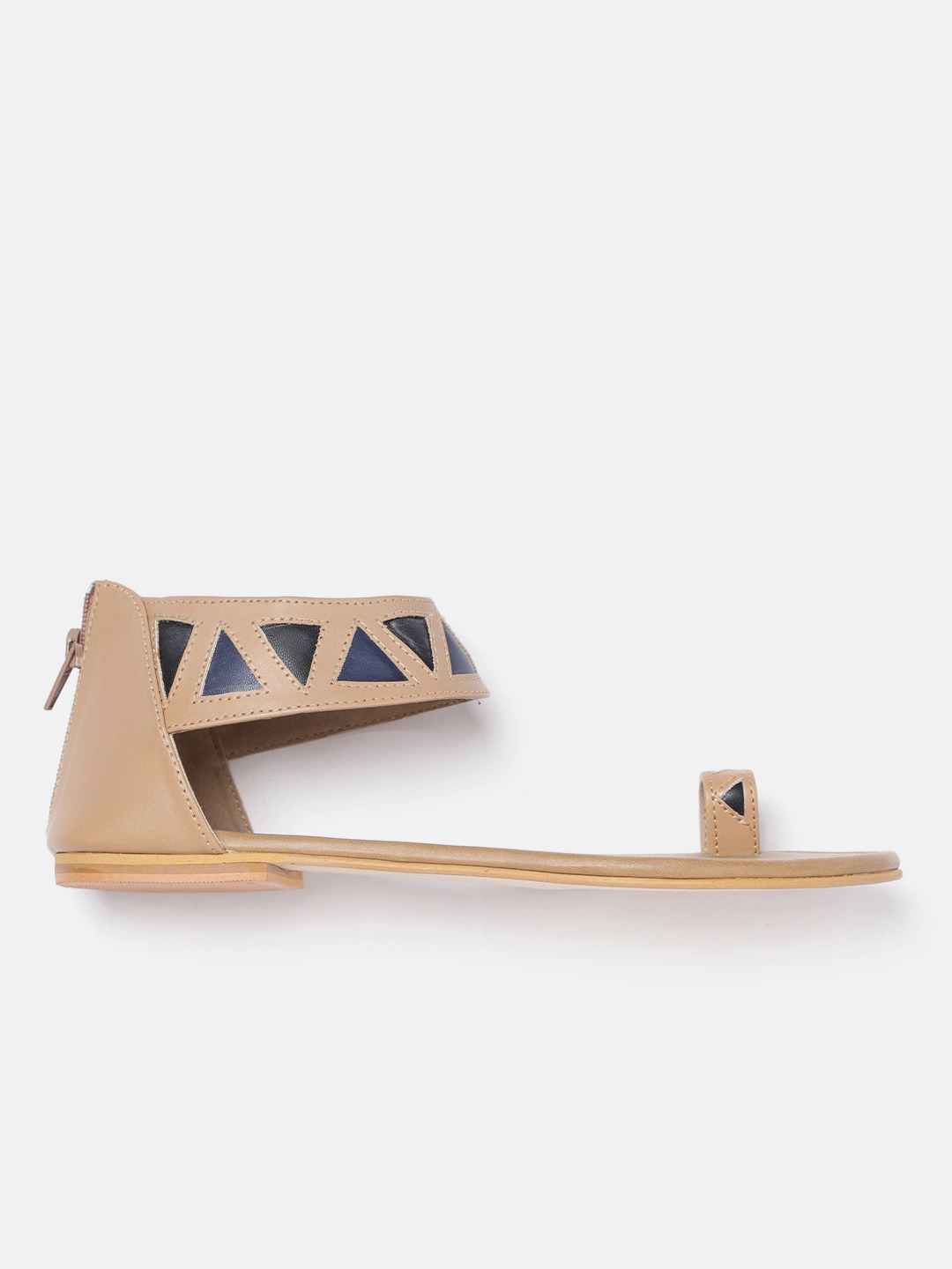A pair of beige, black and navy one-toe flats, has regular styling, zip detail