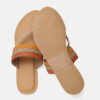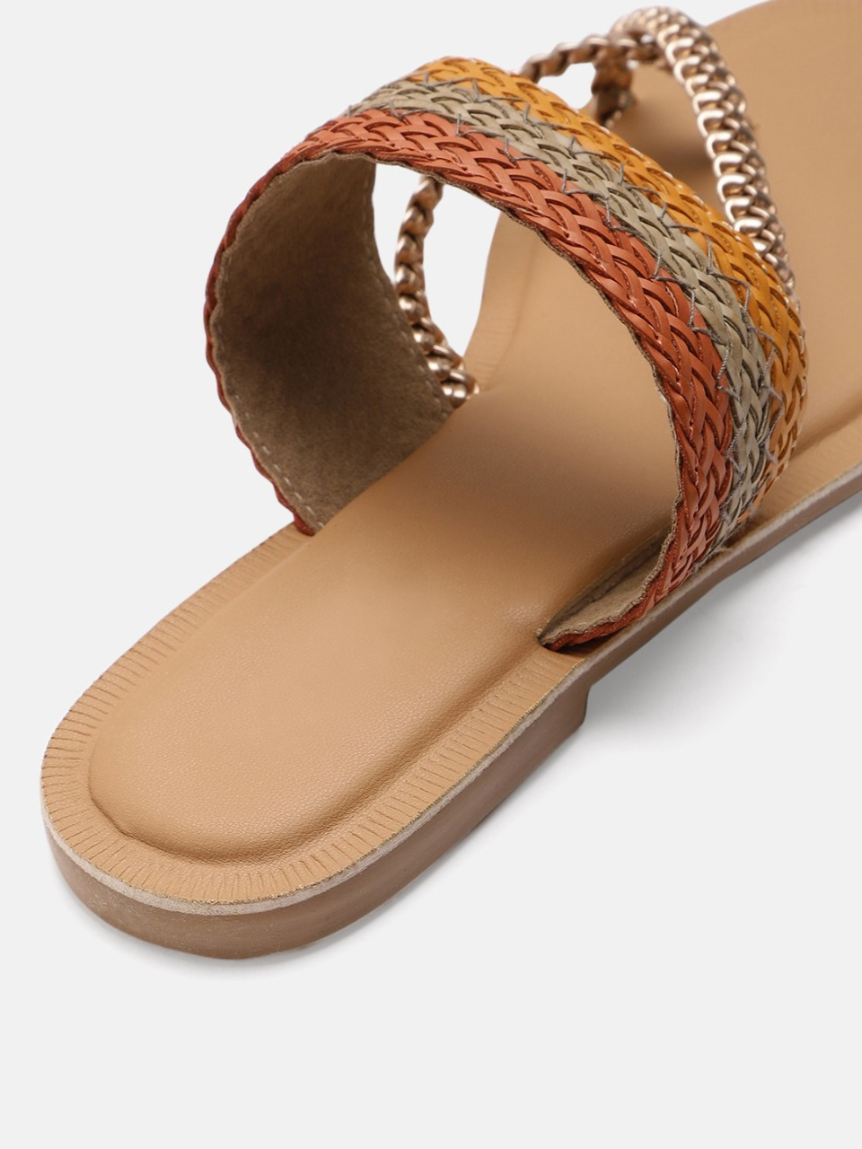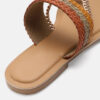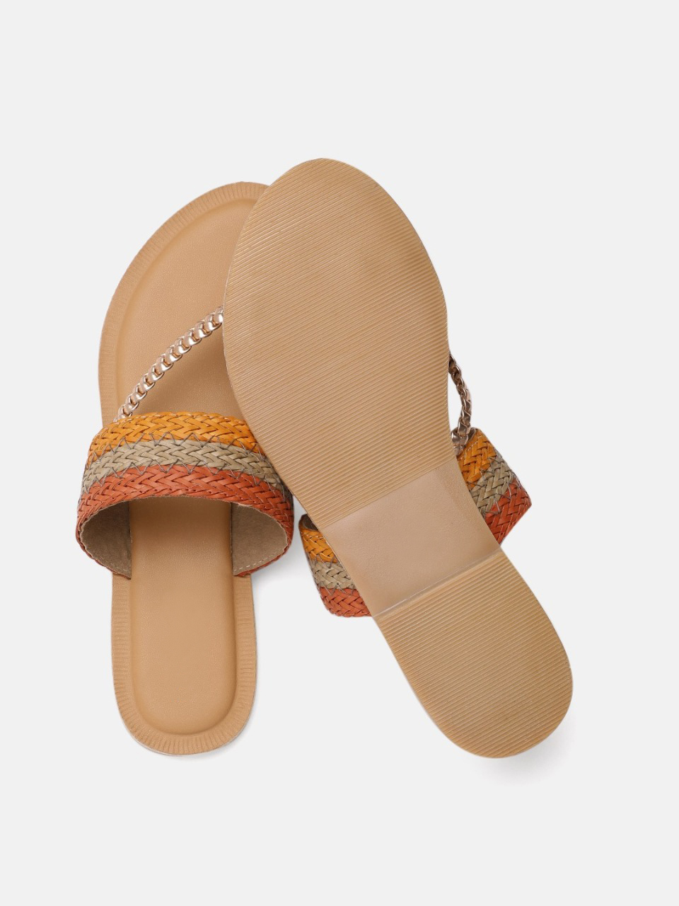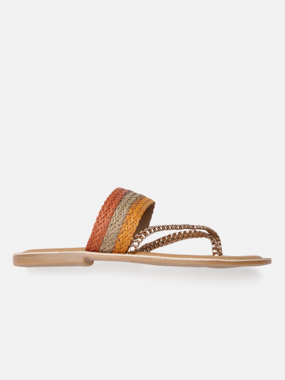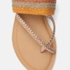 A pair of beige and gold-toned woven design open-toed flats, has regular styling, no back strap detail