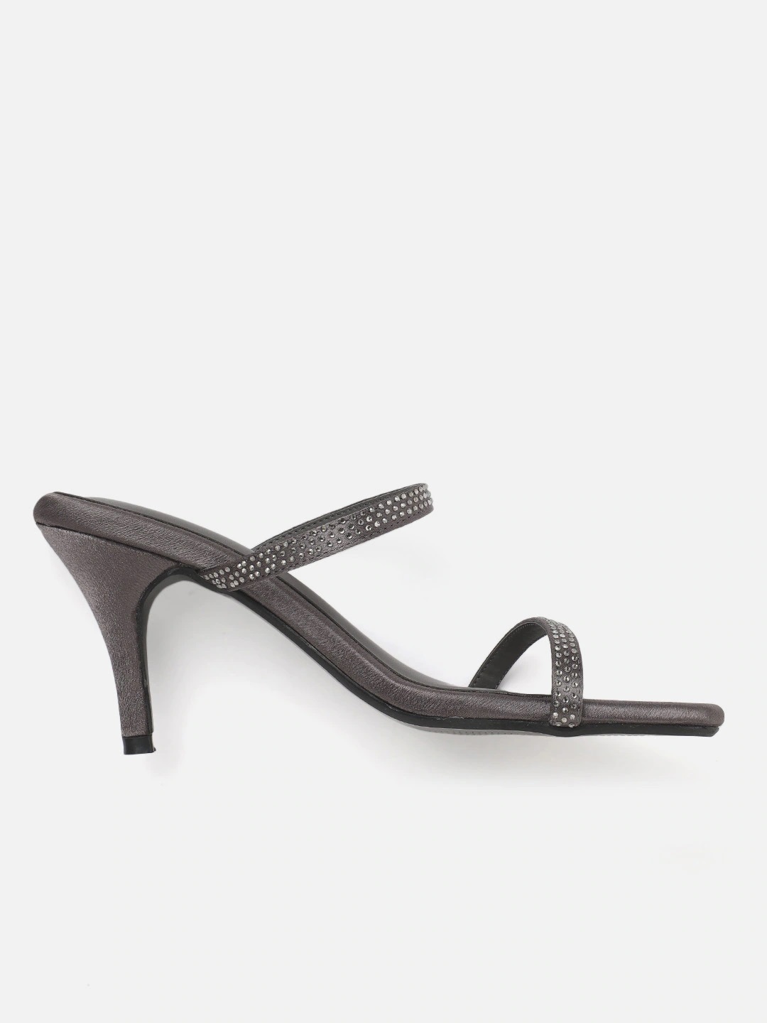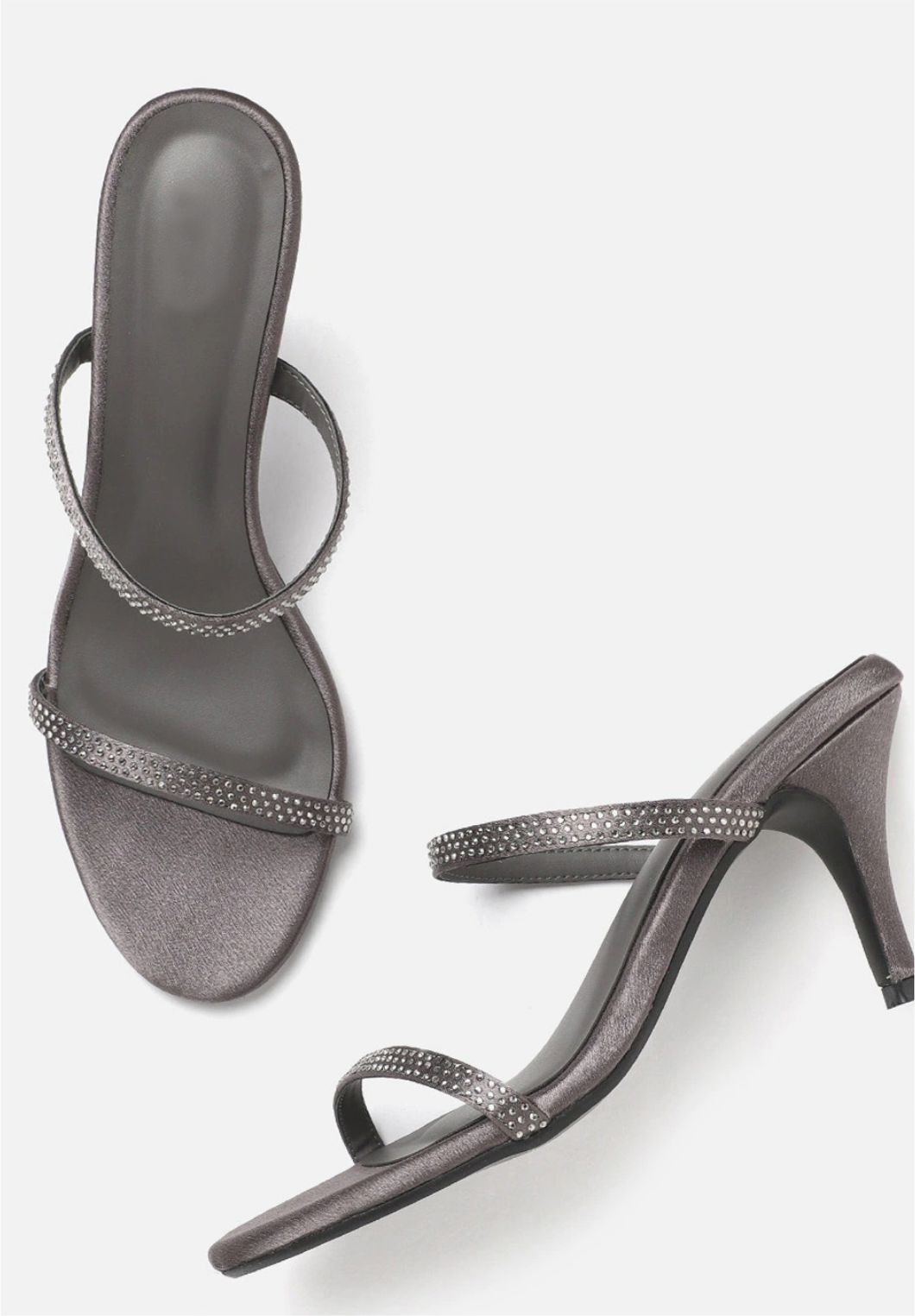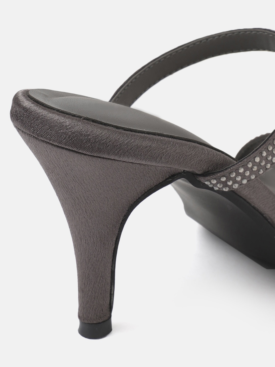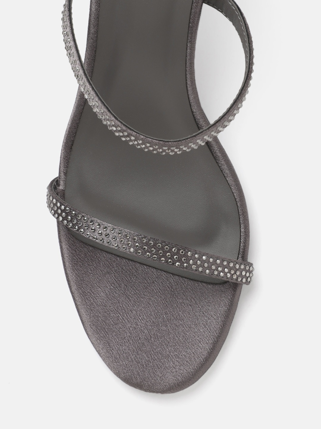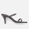 A pair of charcoal grey open toe heels, has regular ankle and open back