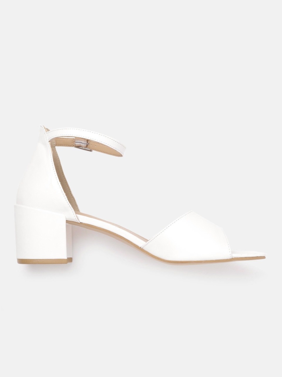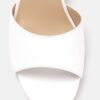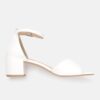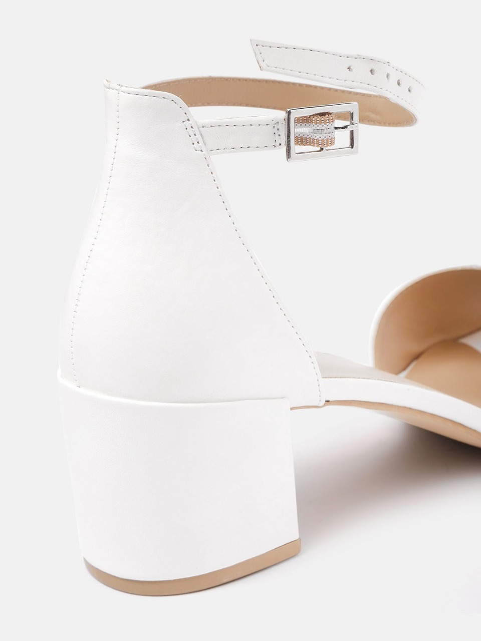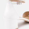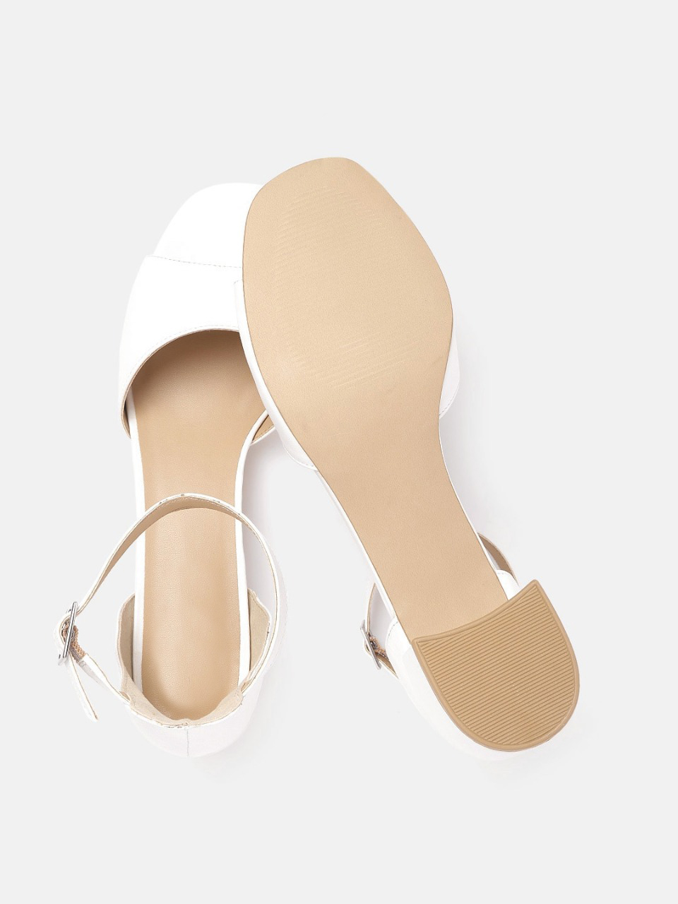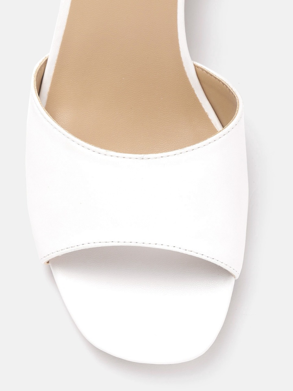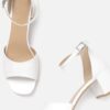 A pair of white solid open toe heels, has mid-top styling, ankle loop detail
