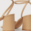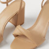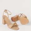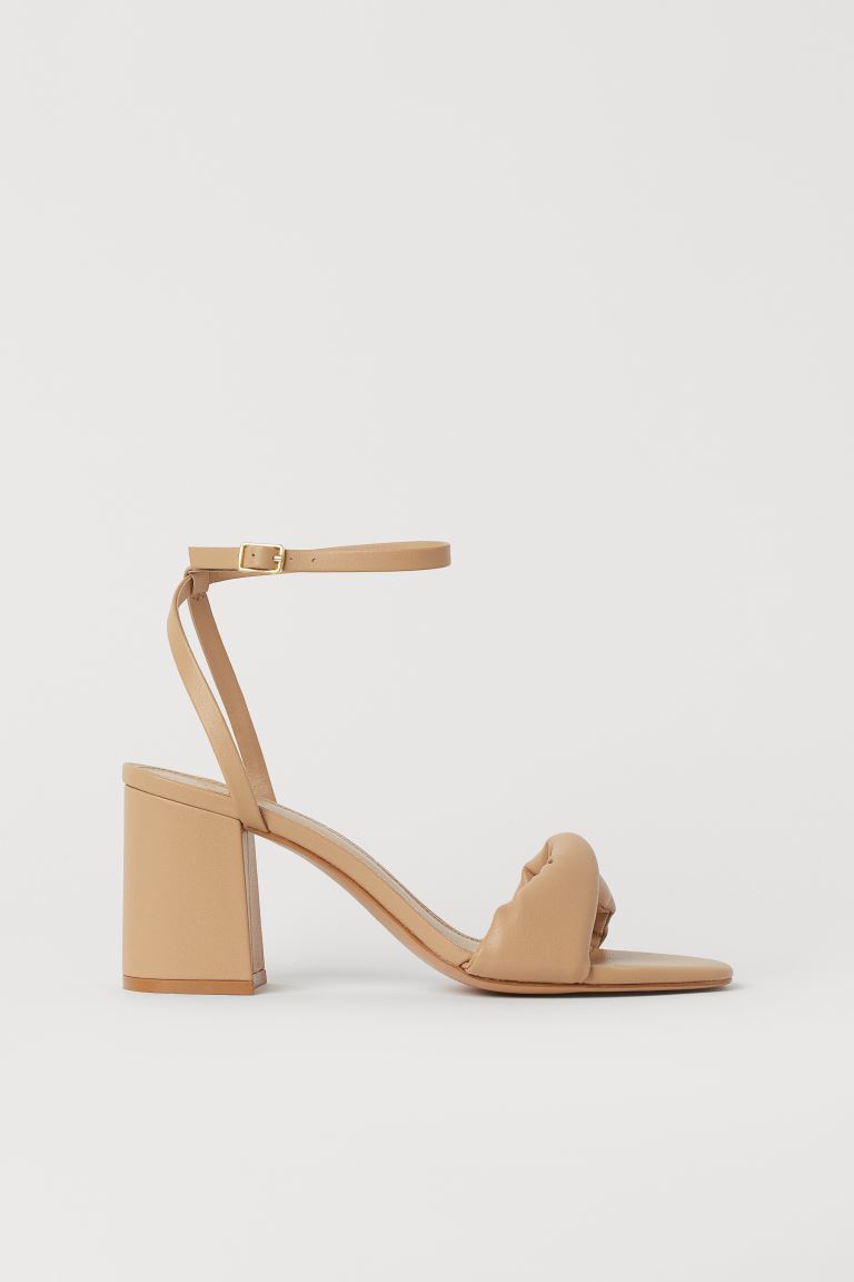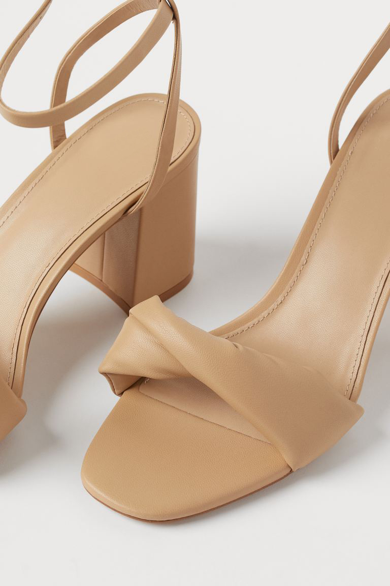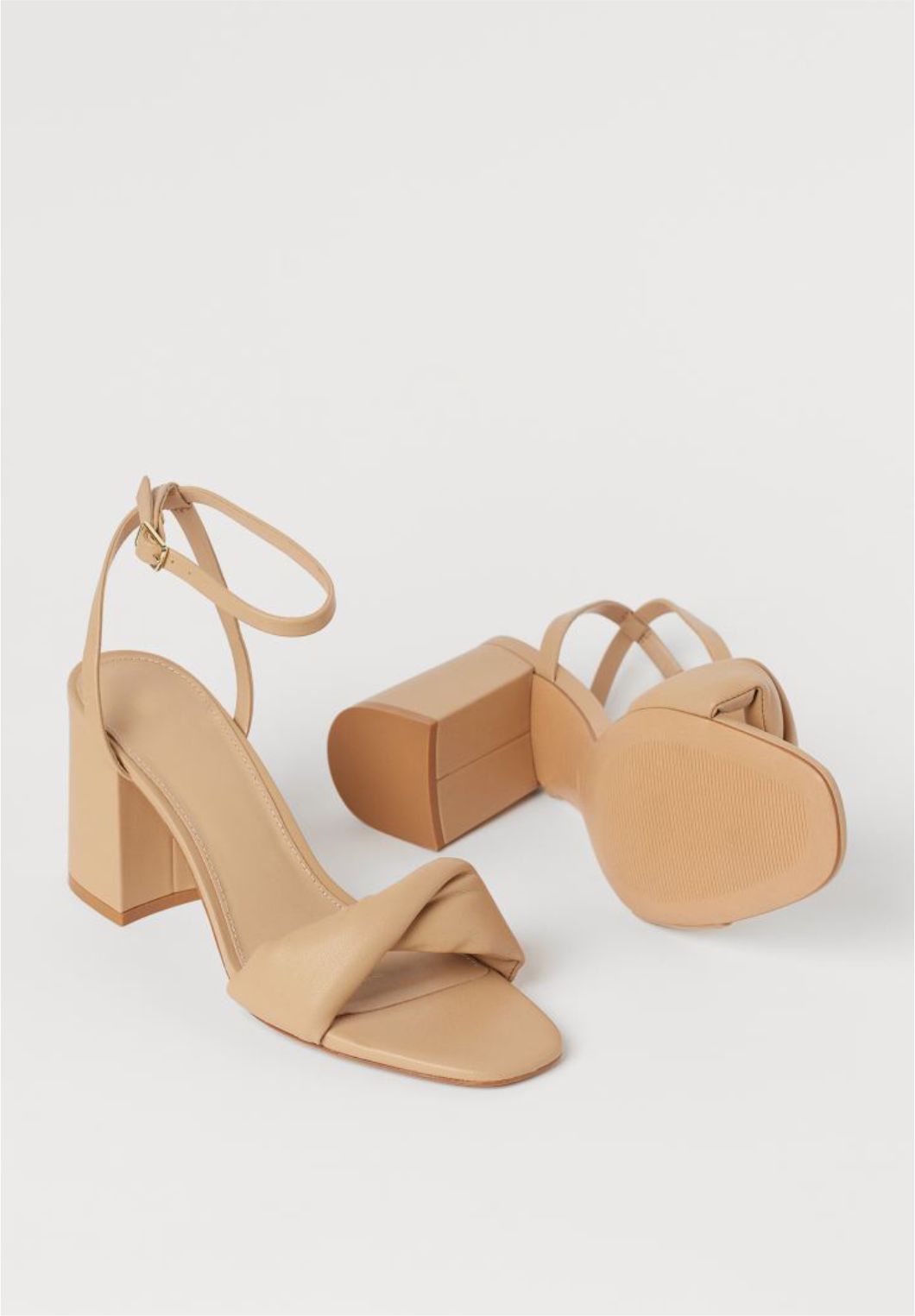 Sandals in imitation leather with a wide, twisted strap over the toes and narrow, adjustable strap around the ankle. Covered