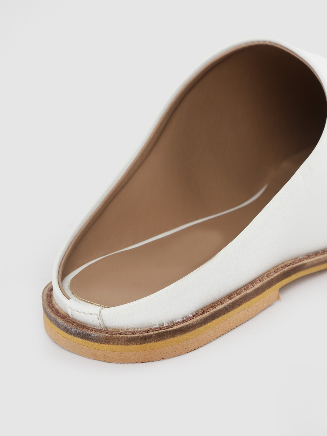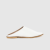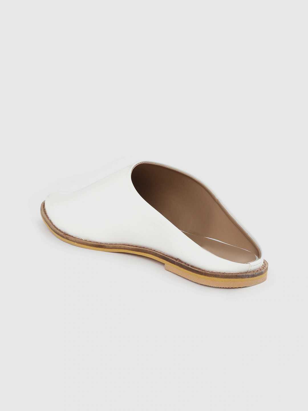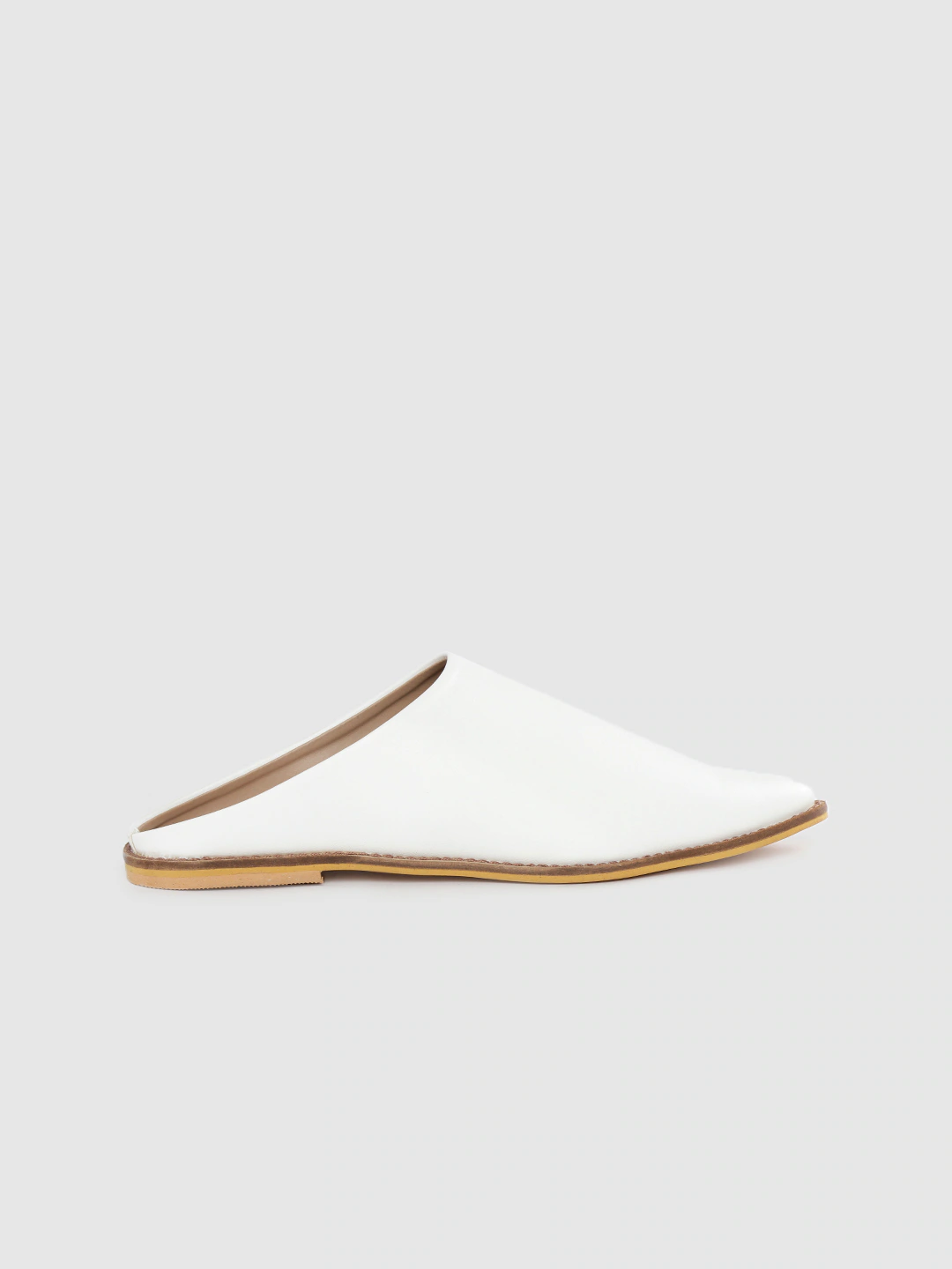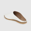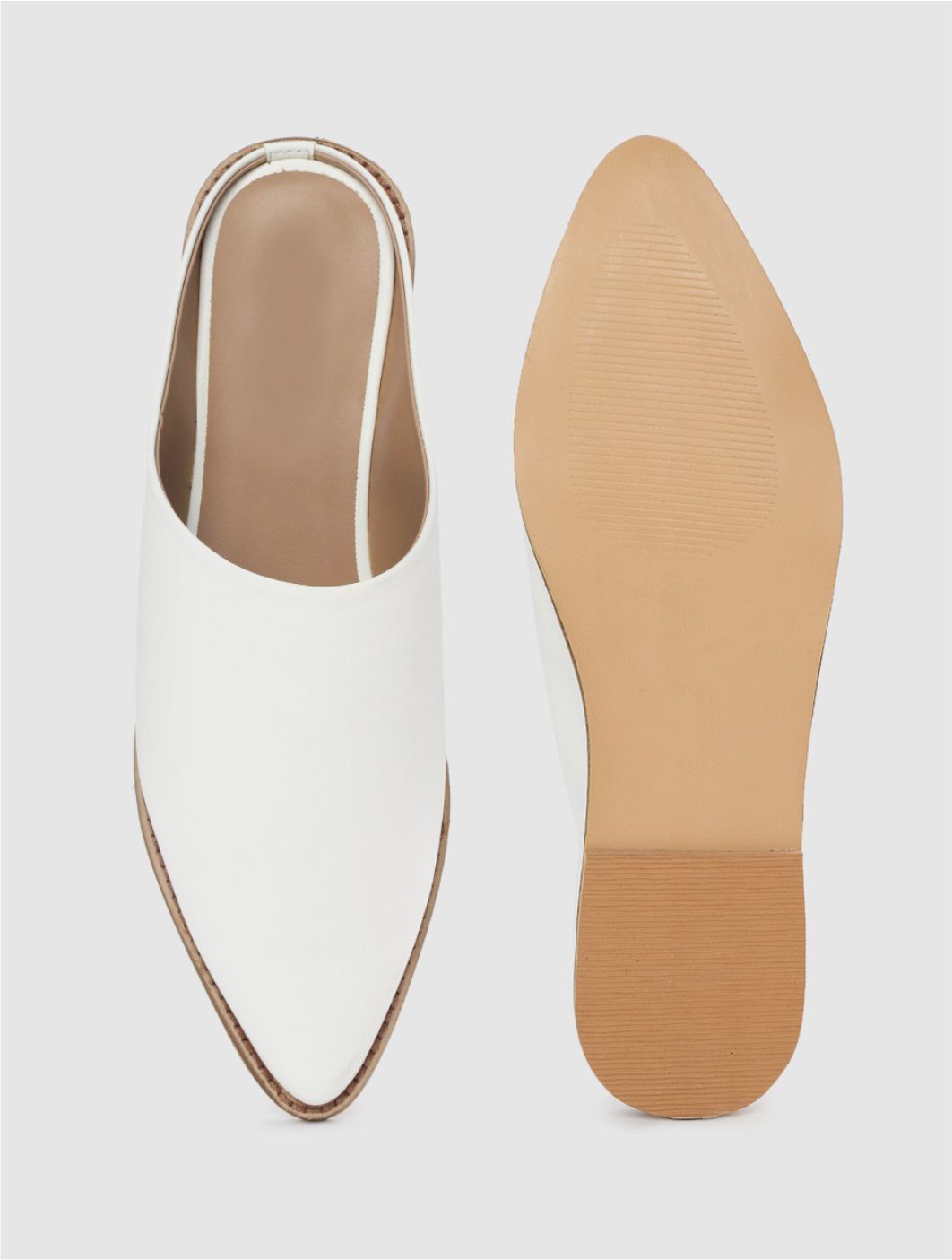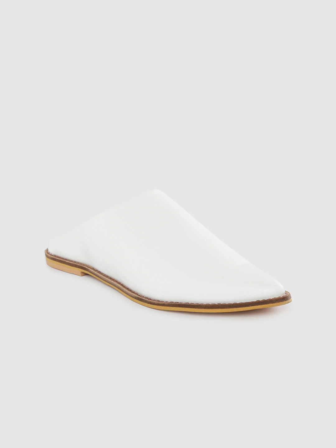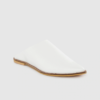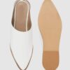 A pair of white pointed toe mules, has regular styling, no back strap detail