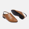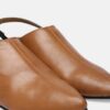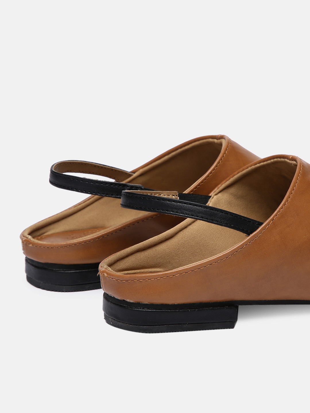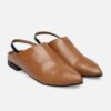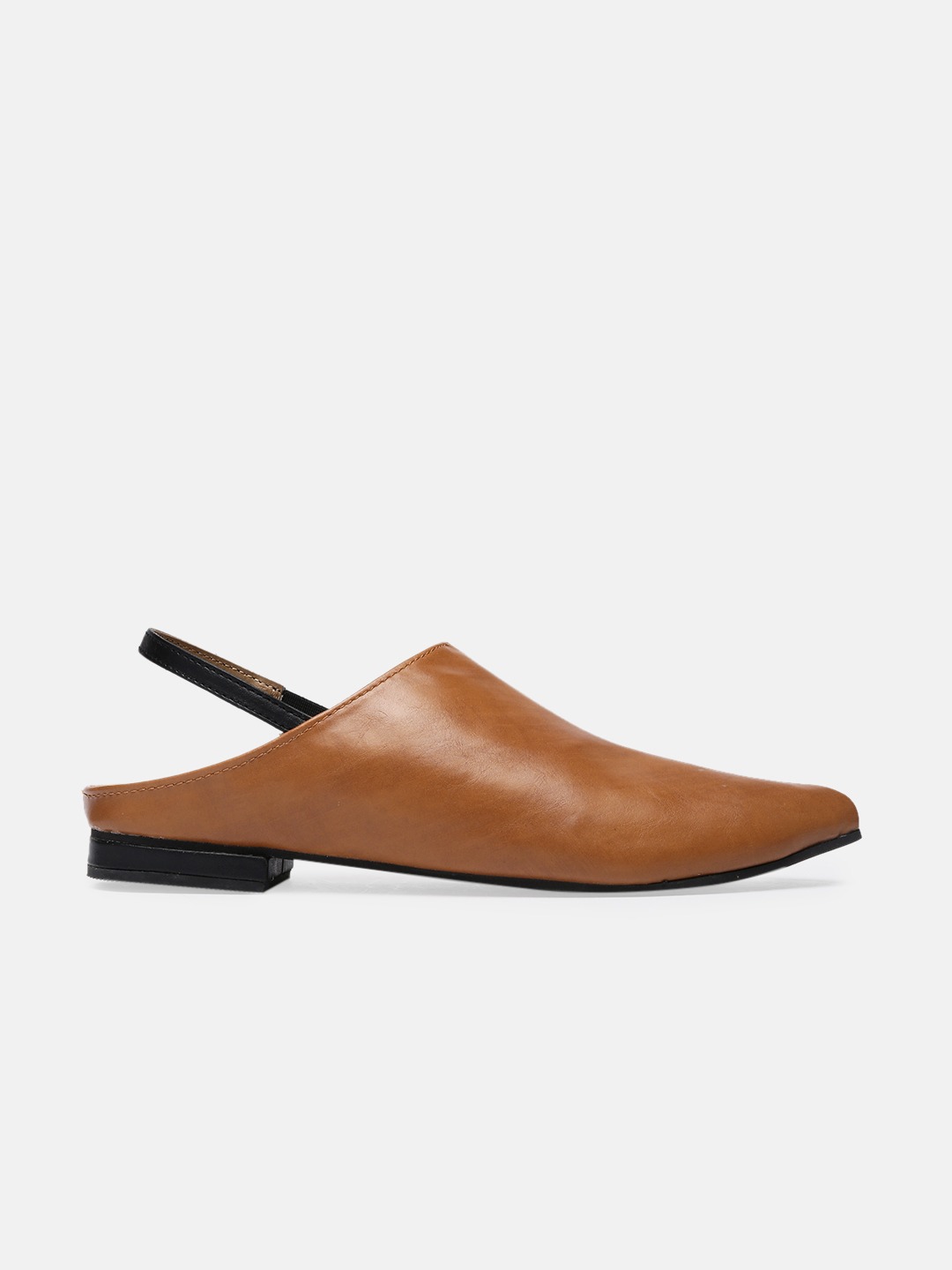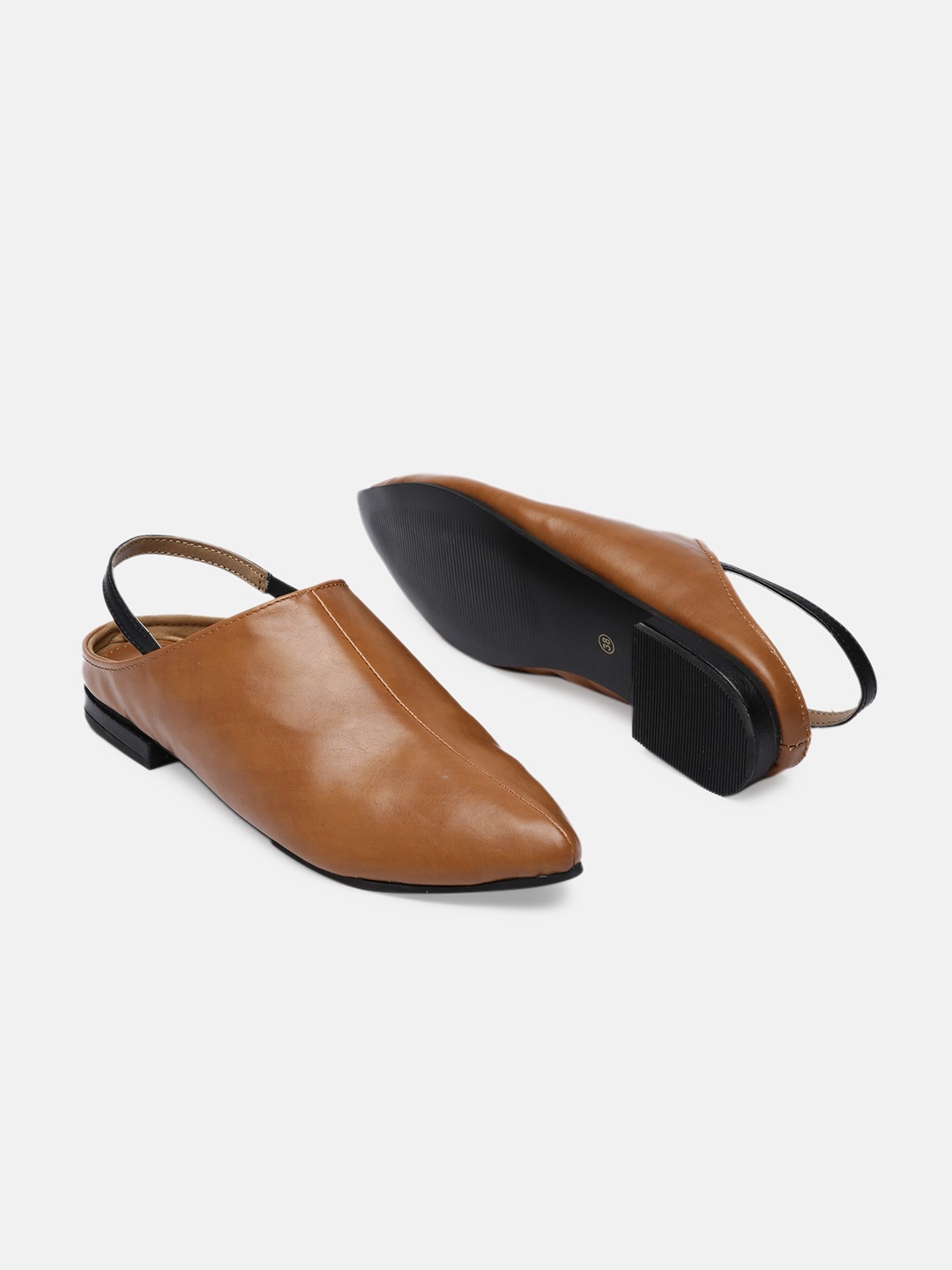 A pair of pointed closed toe tan brown mules with comfort lining and foam cushioned footbed for your work-from-home needs. It has regular styling, and closed back