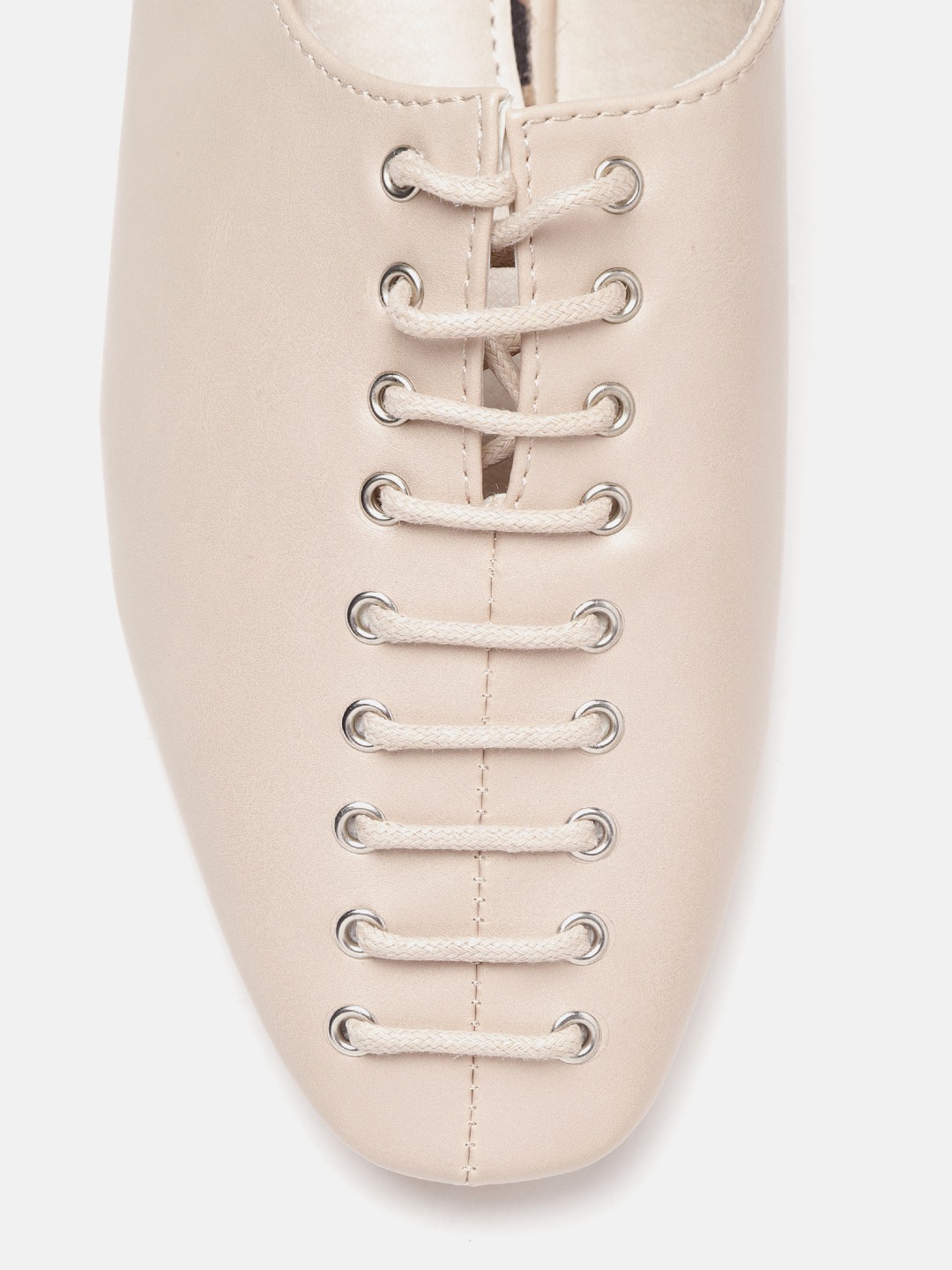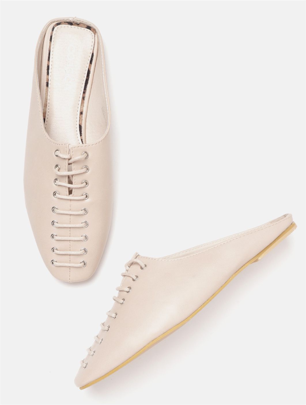 A pair of beige square toe mules, has regular styling, no back strap detail