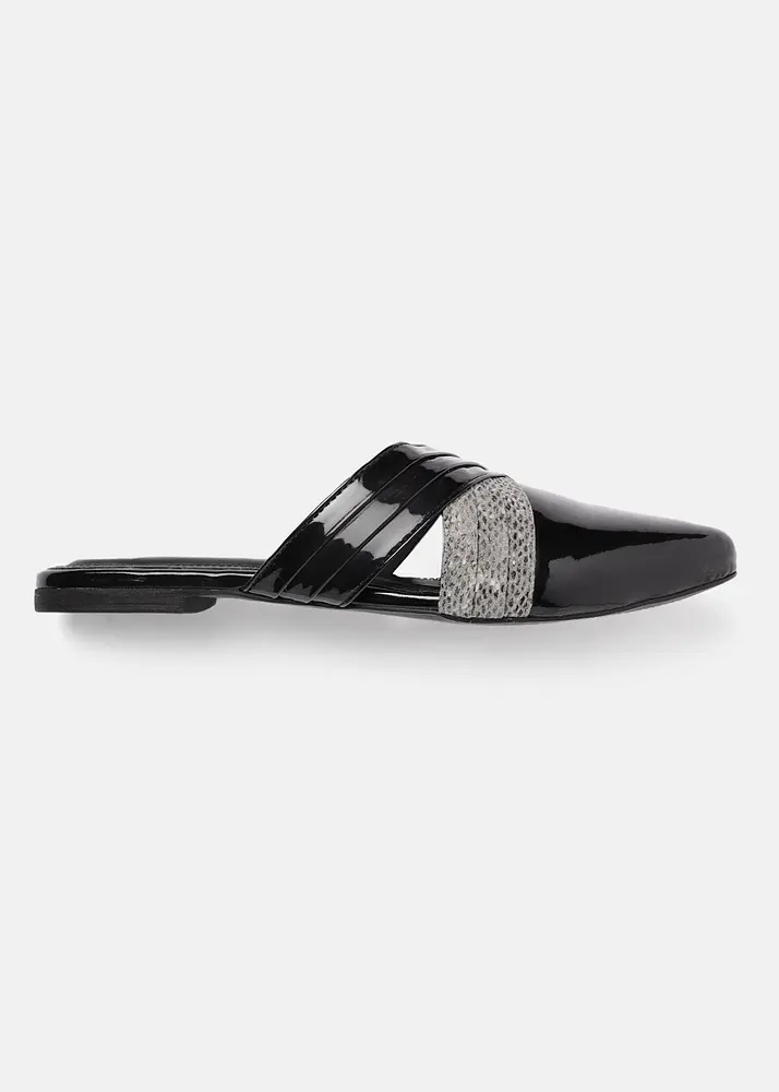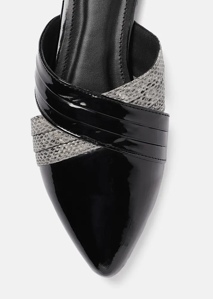 A pair of Black pointed toe mules, has Animal print styling, no back strap detail