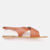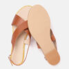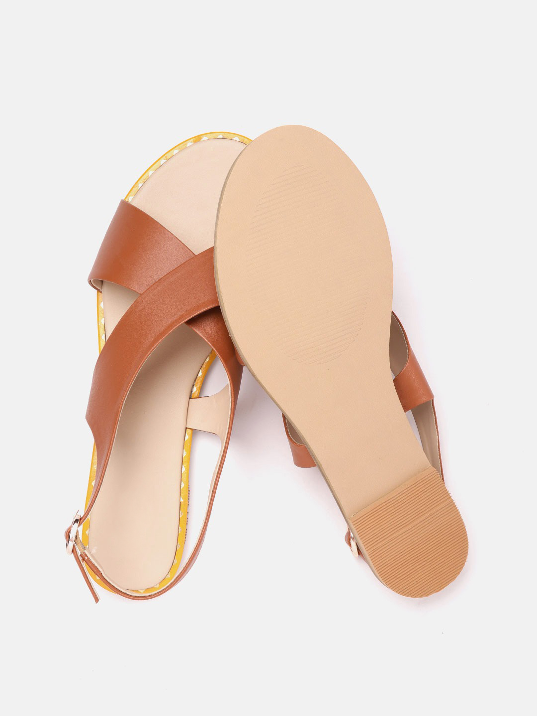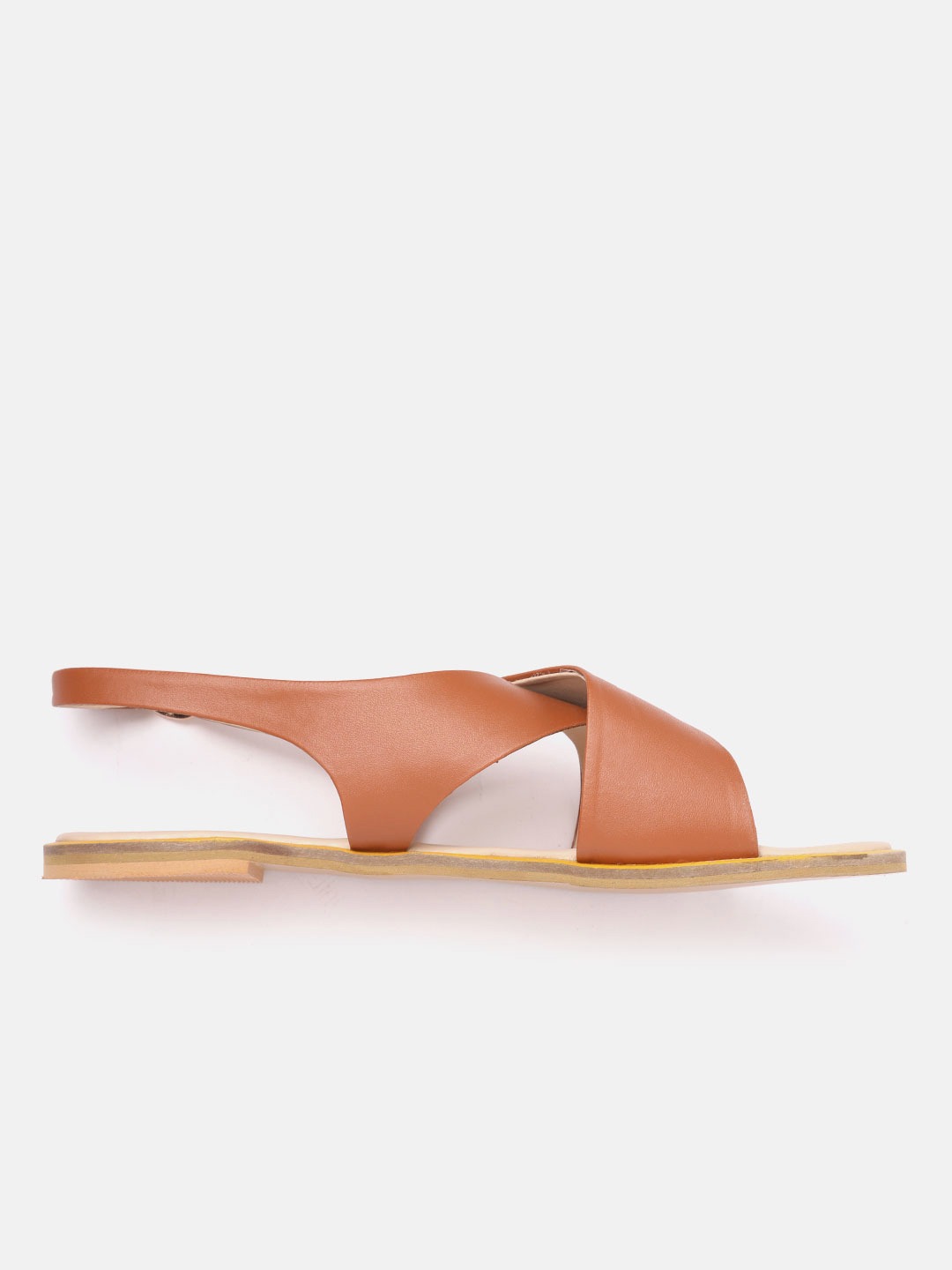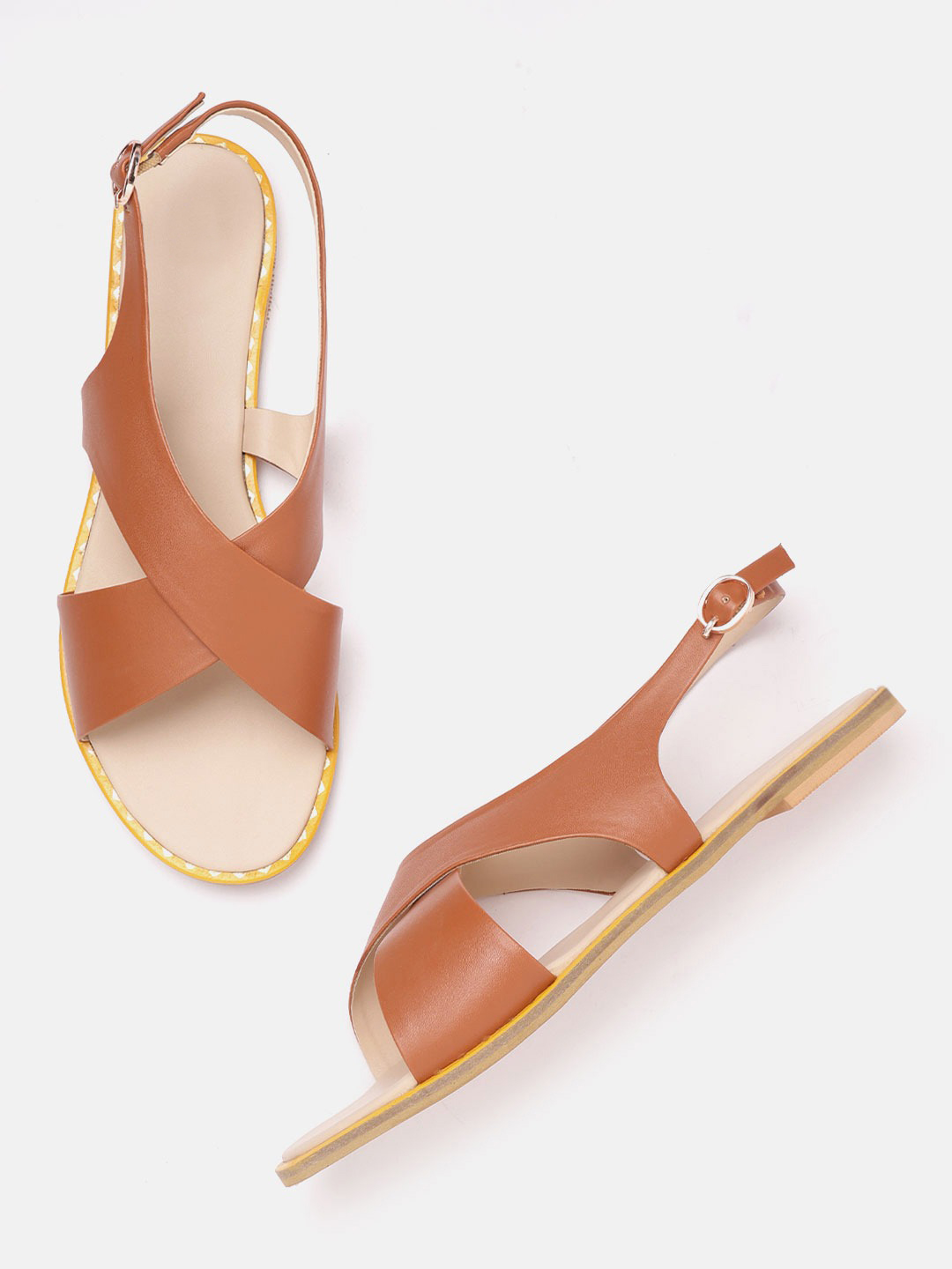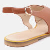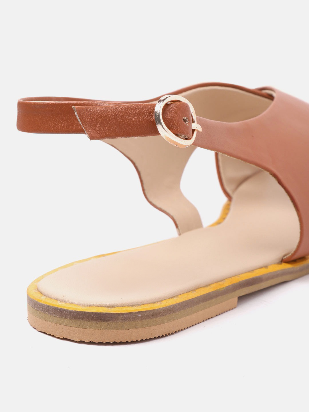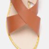 A pair of brown open-toed flats, has regular styling, buckle detail