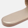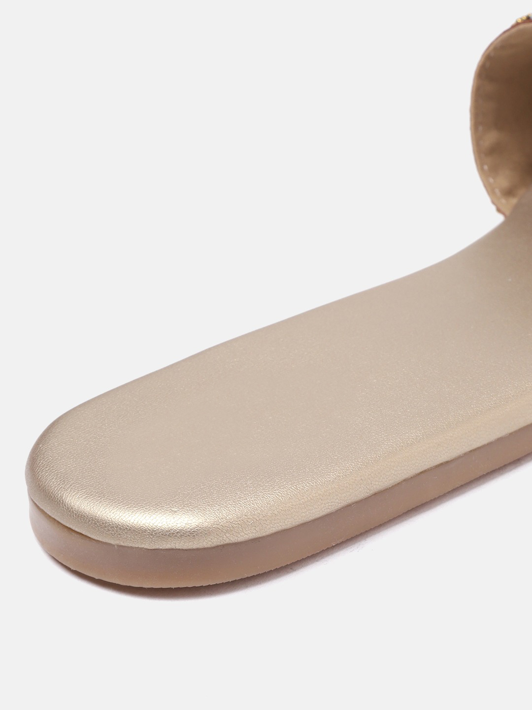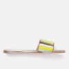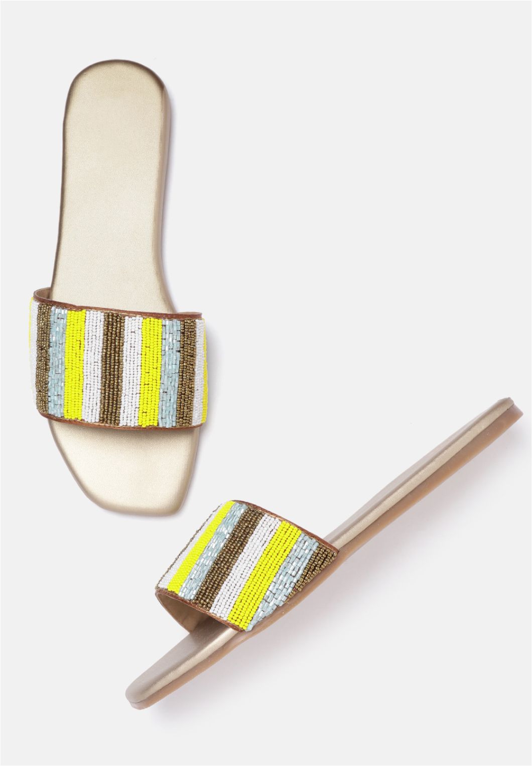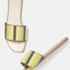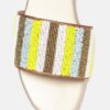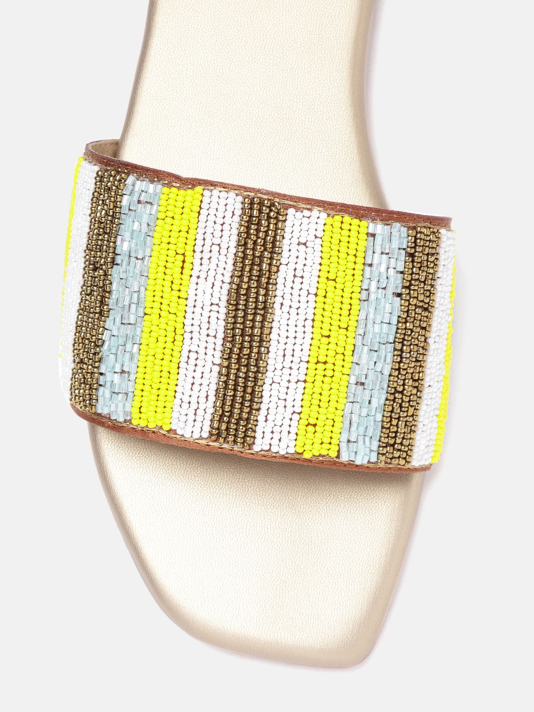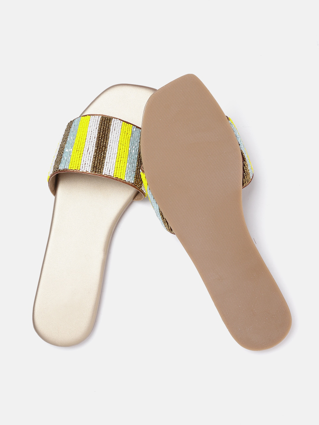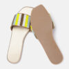 A pair of multicolored striped and beaded handmade open-toed flats, has regular styling, no back strap detail