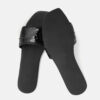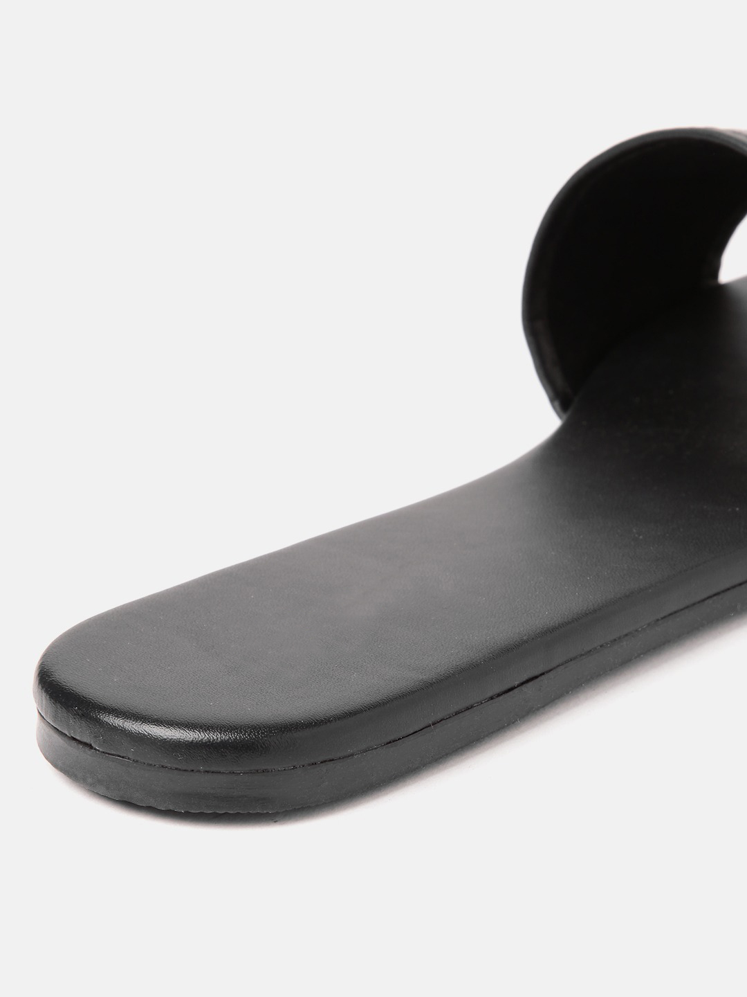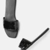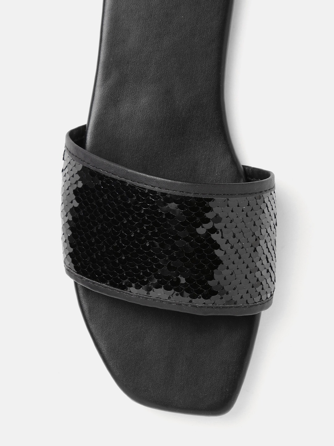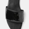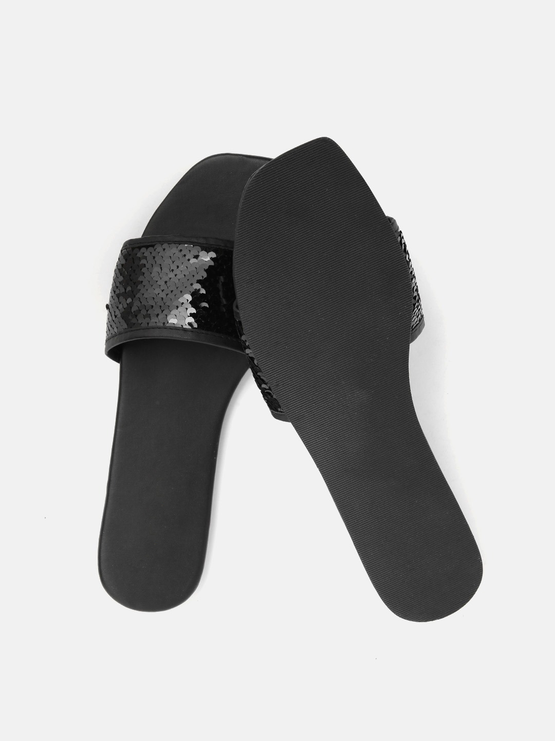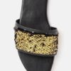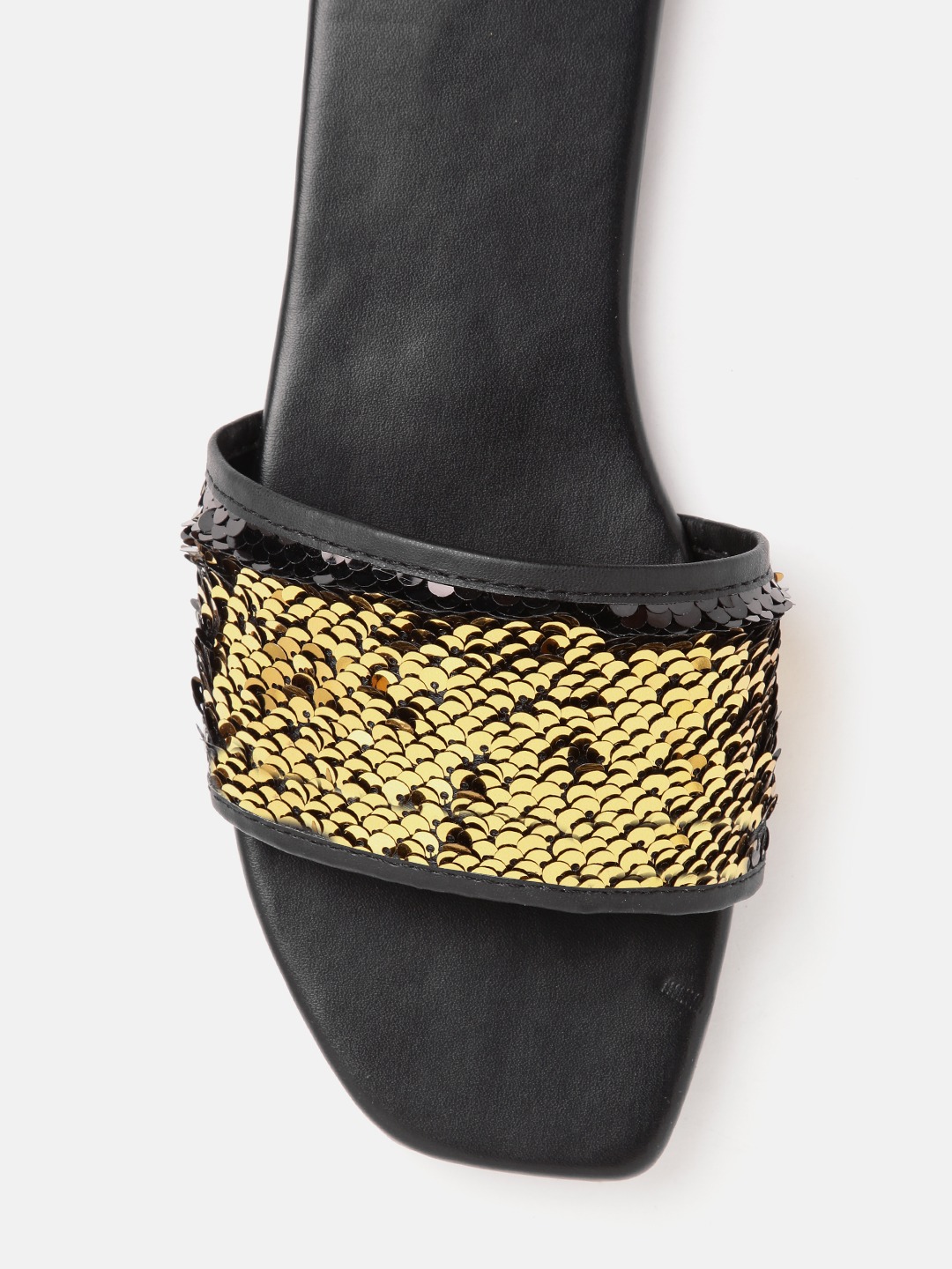 A pair of black and gold-toned flip sequined open toe flats, has regular styling and no backstrap detail
