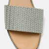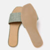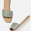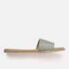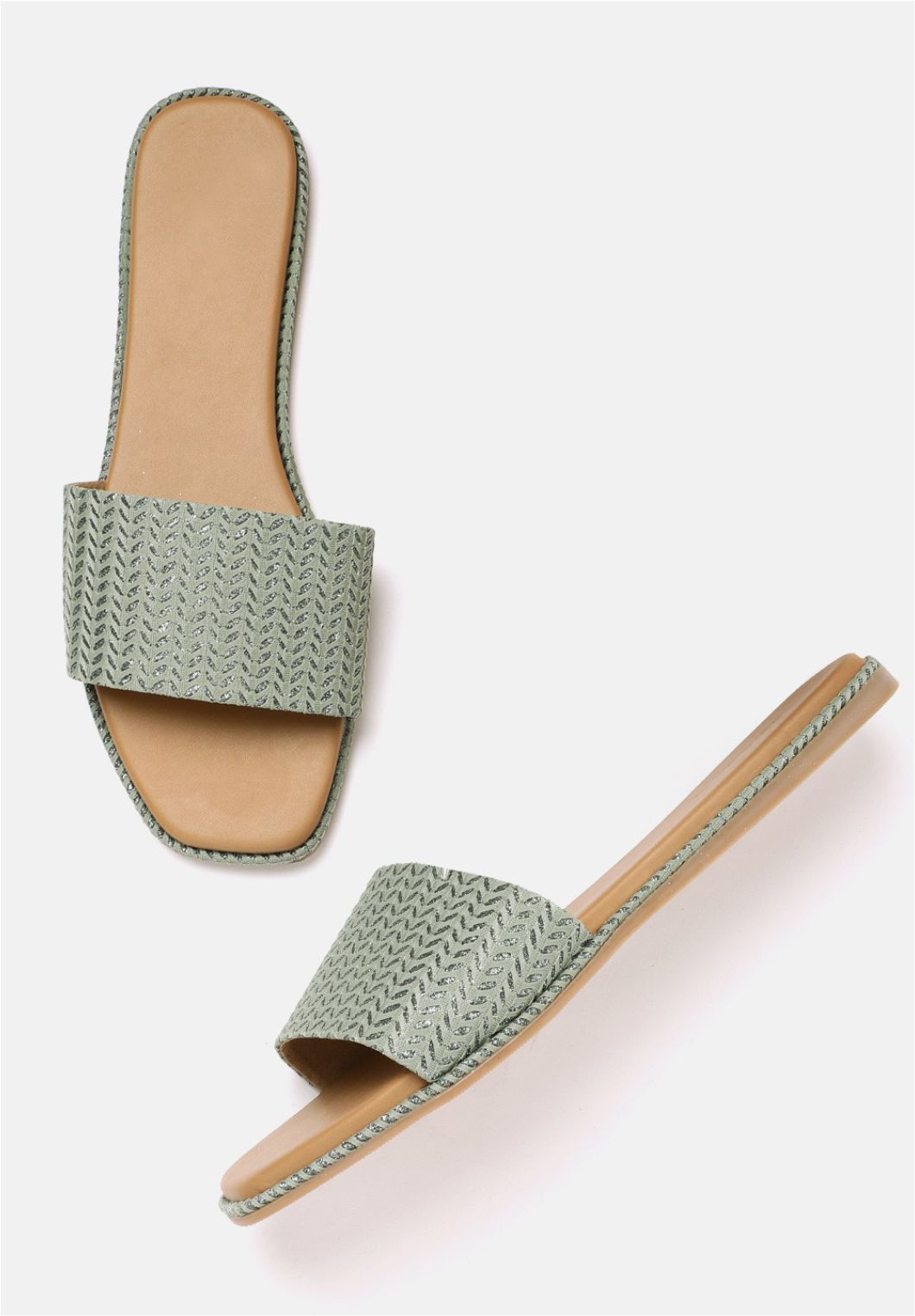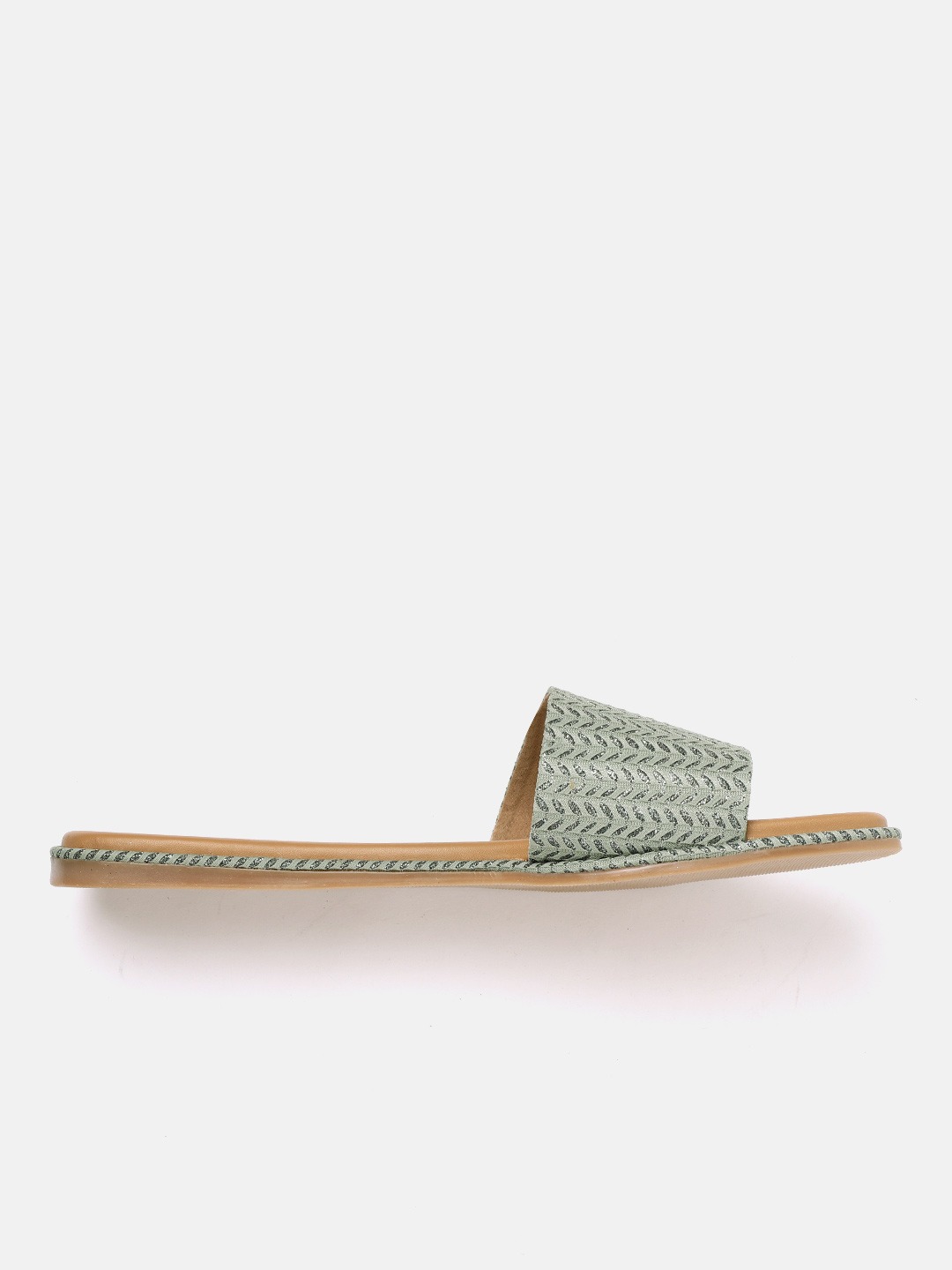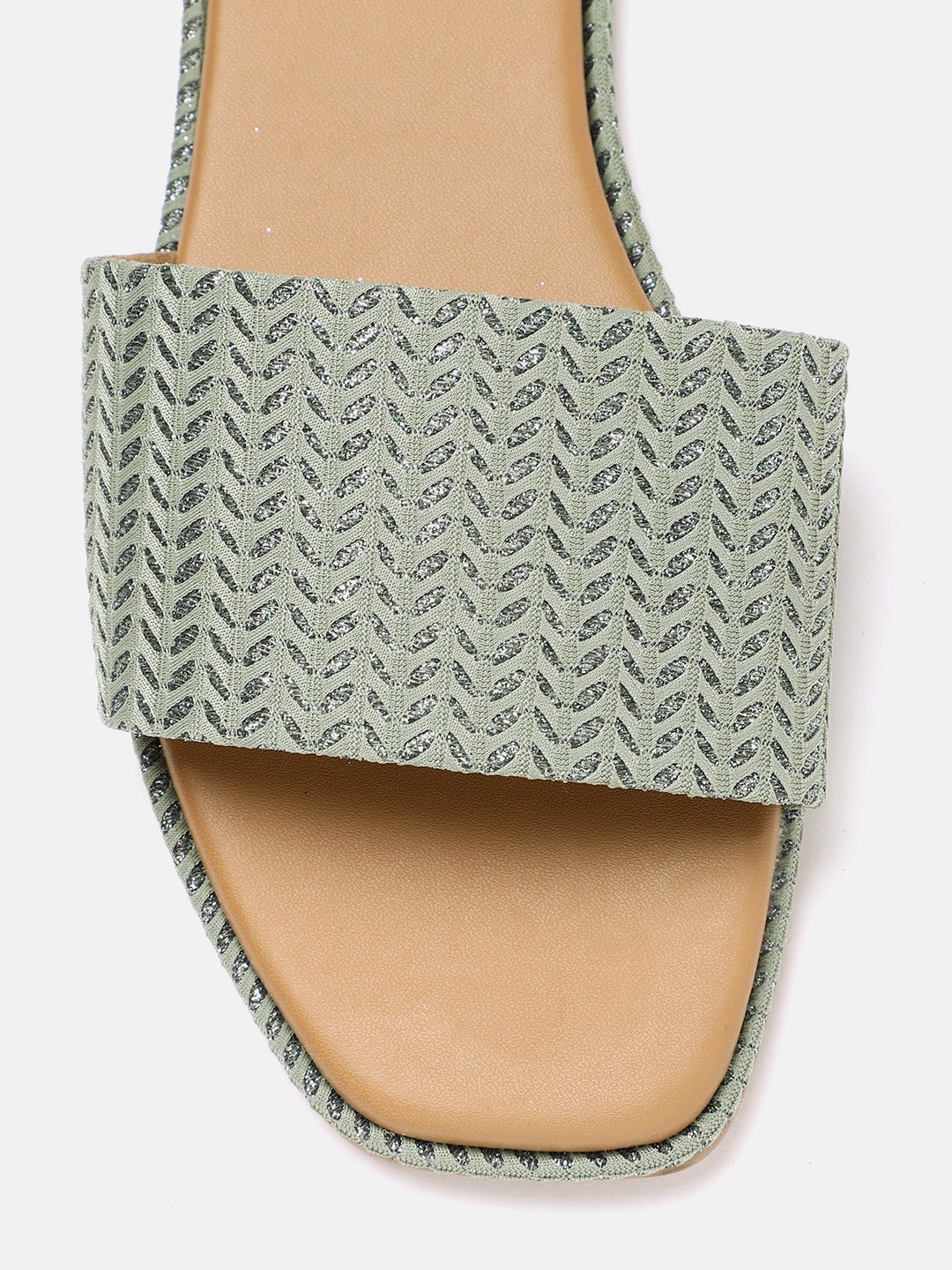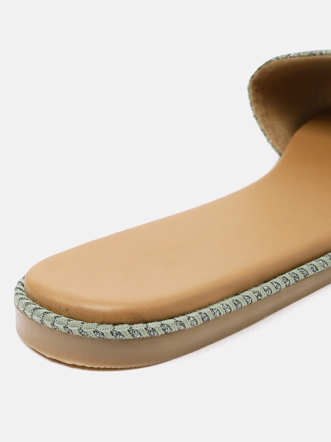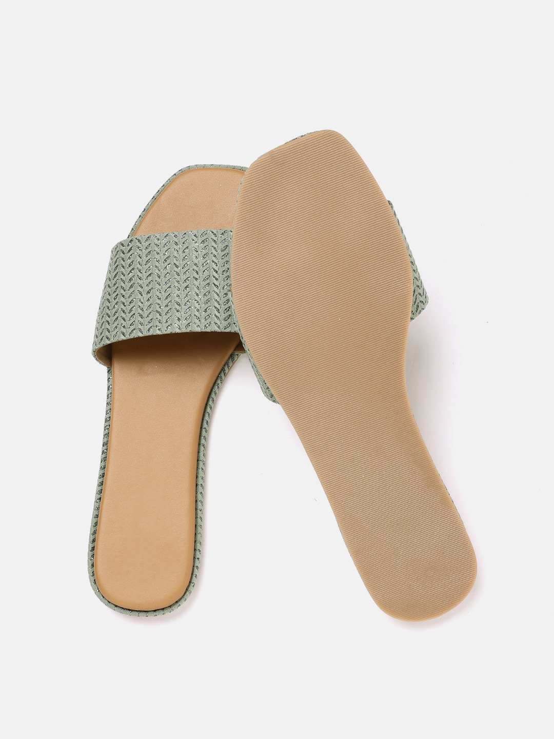 A pair of olive green woven design open toe flats with shimmer detail, has regular styling and no backstrap detail