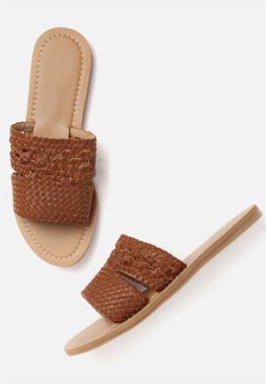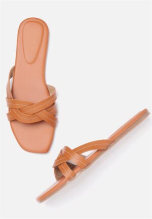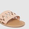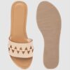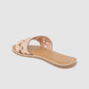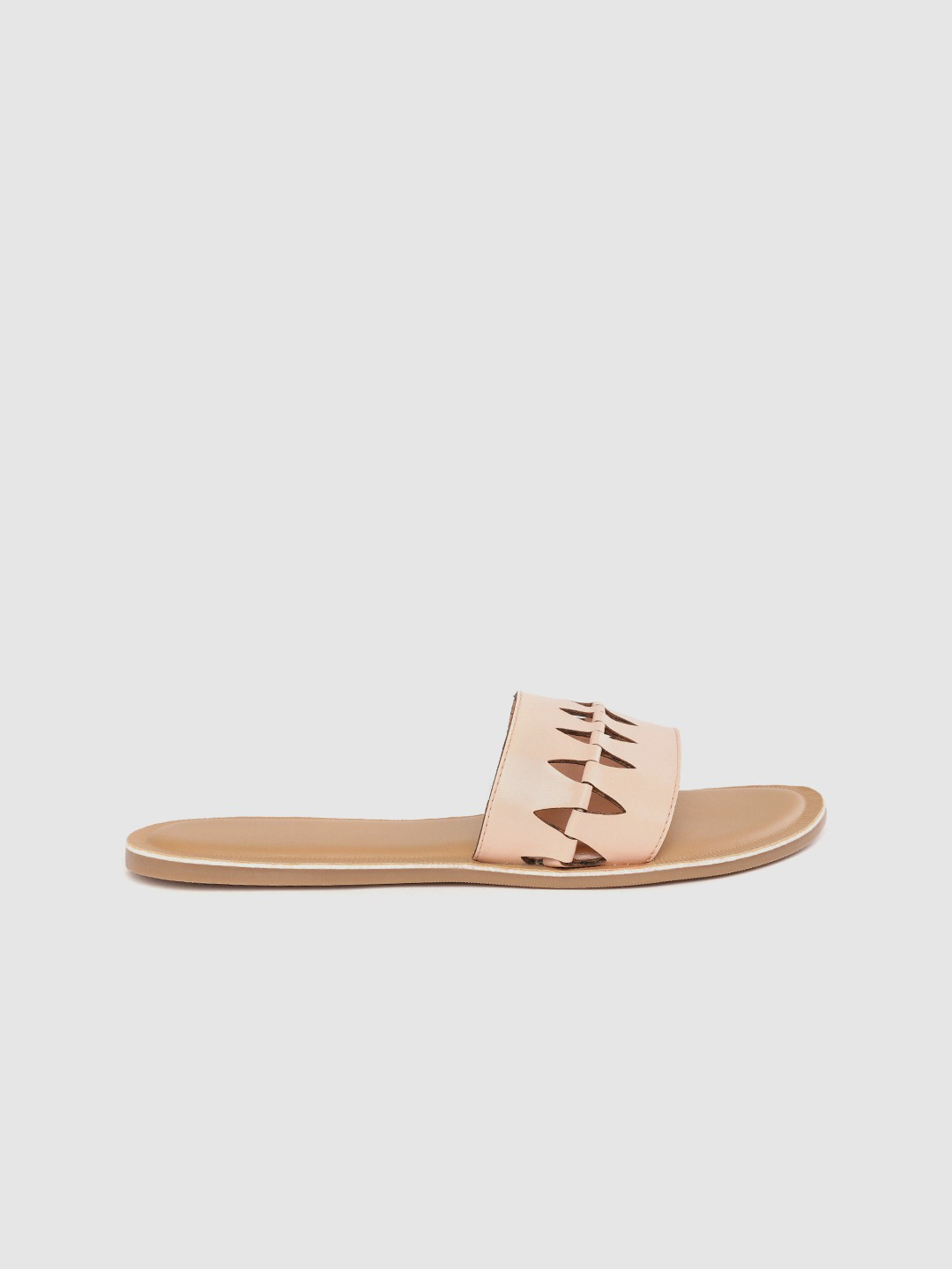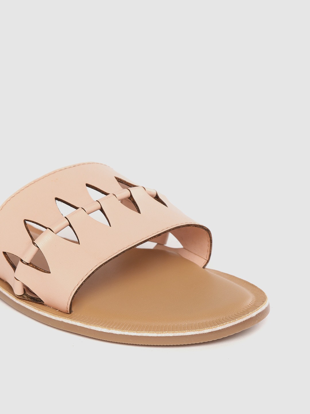 A pair of peach-colored laser cut open toe flats, has regular styling, no backstrap detail
