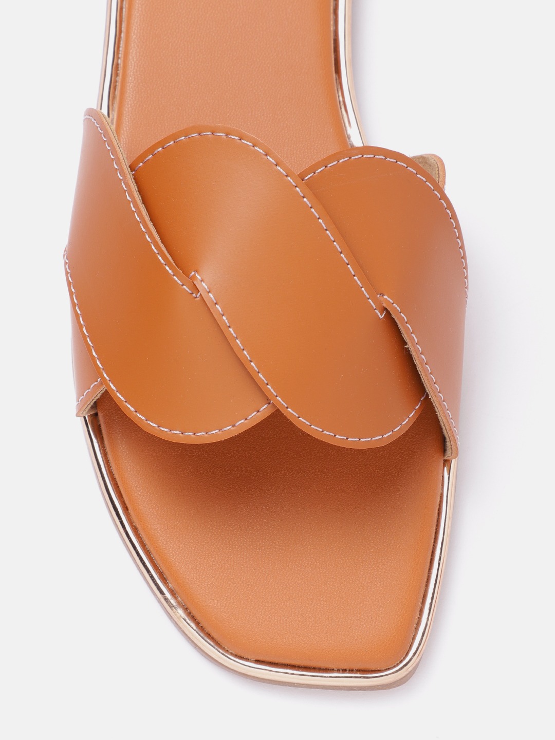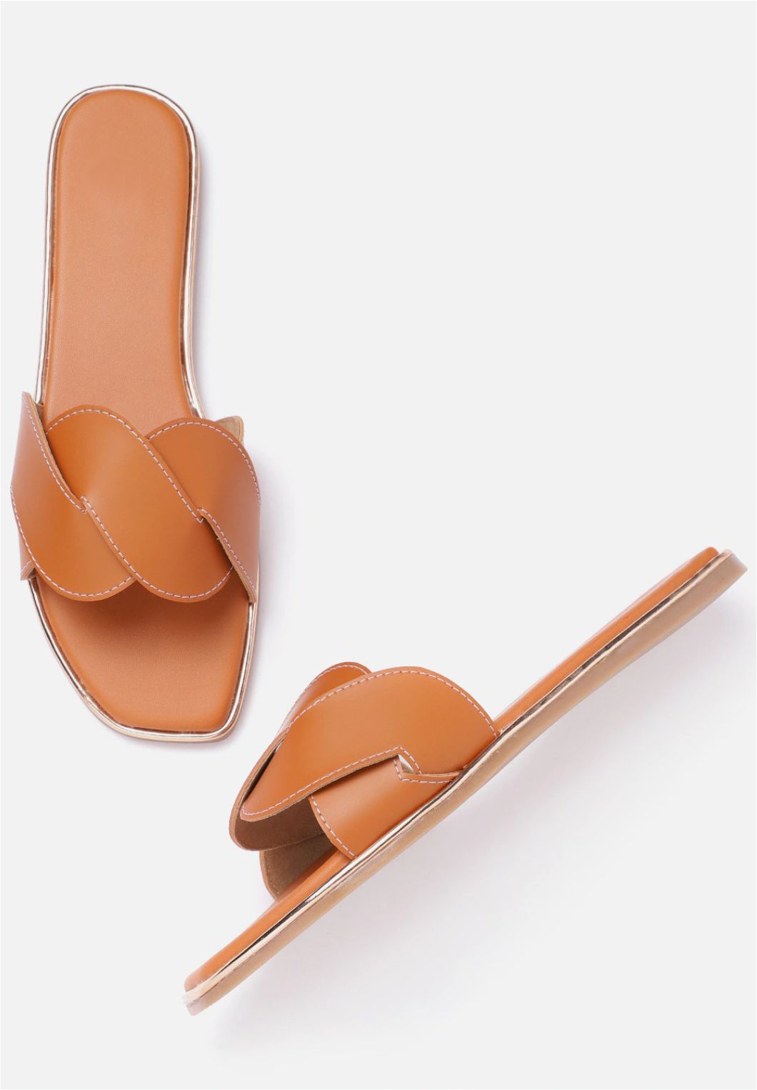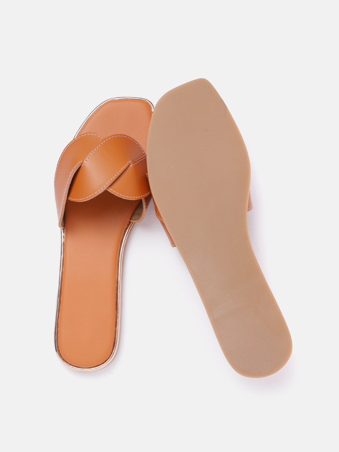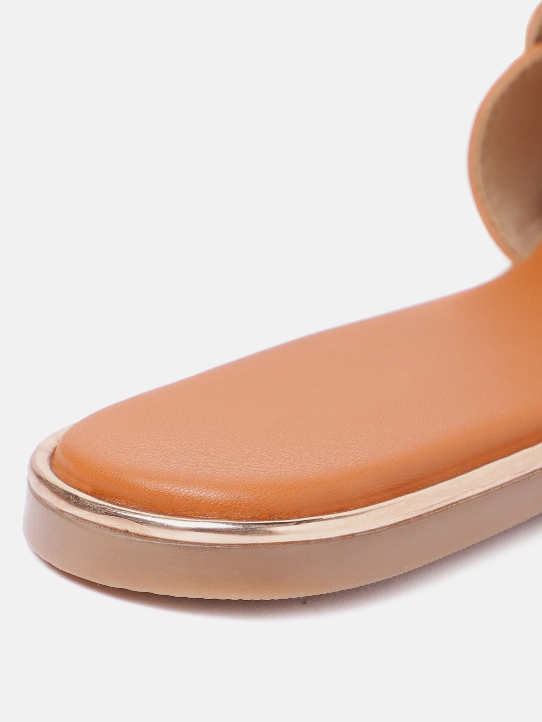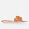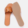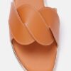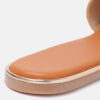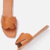 A pair of tan brown open toe flats, has regular styling and no back strap detail