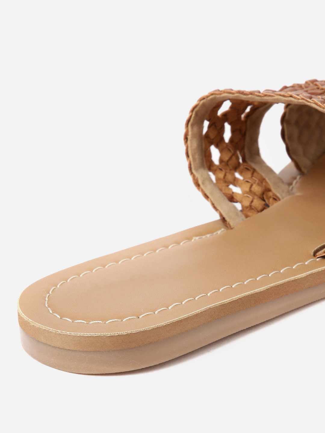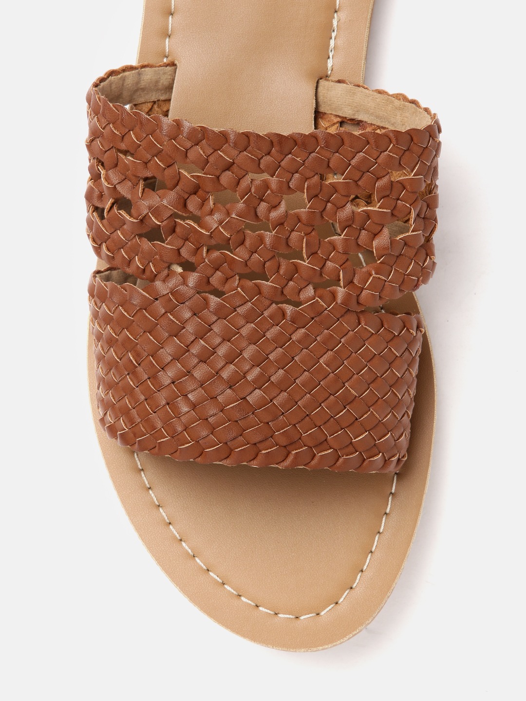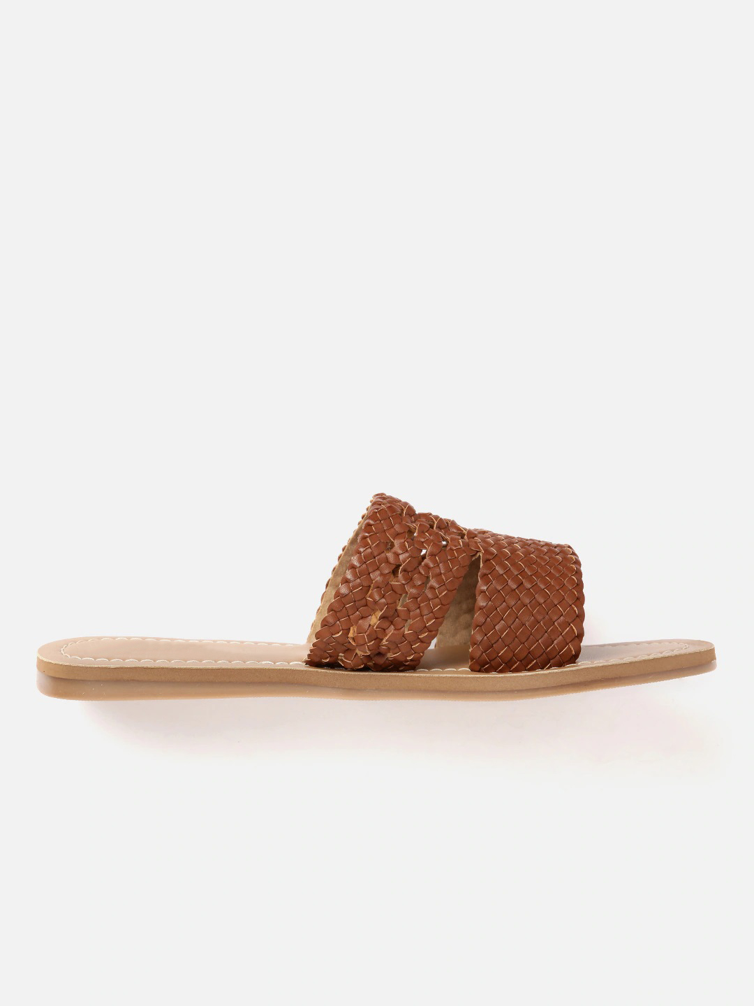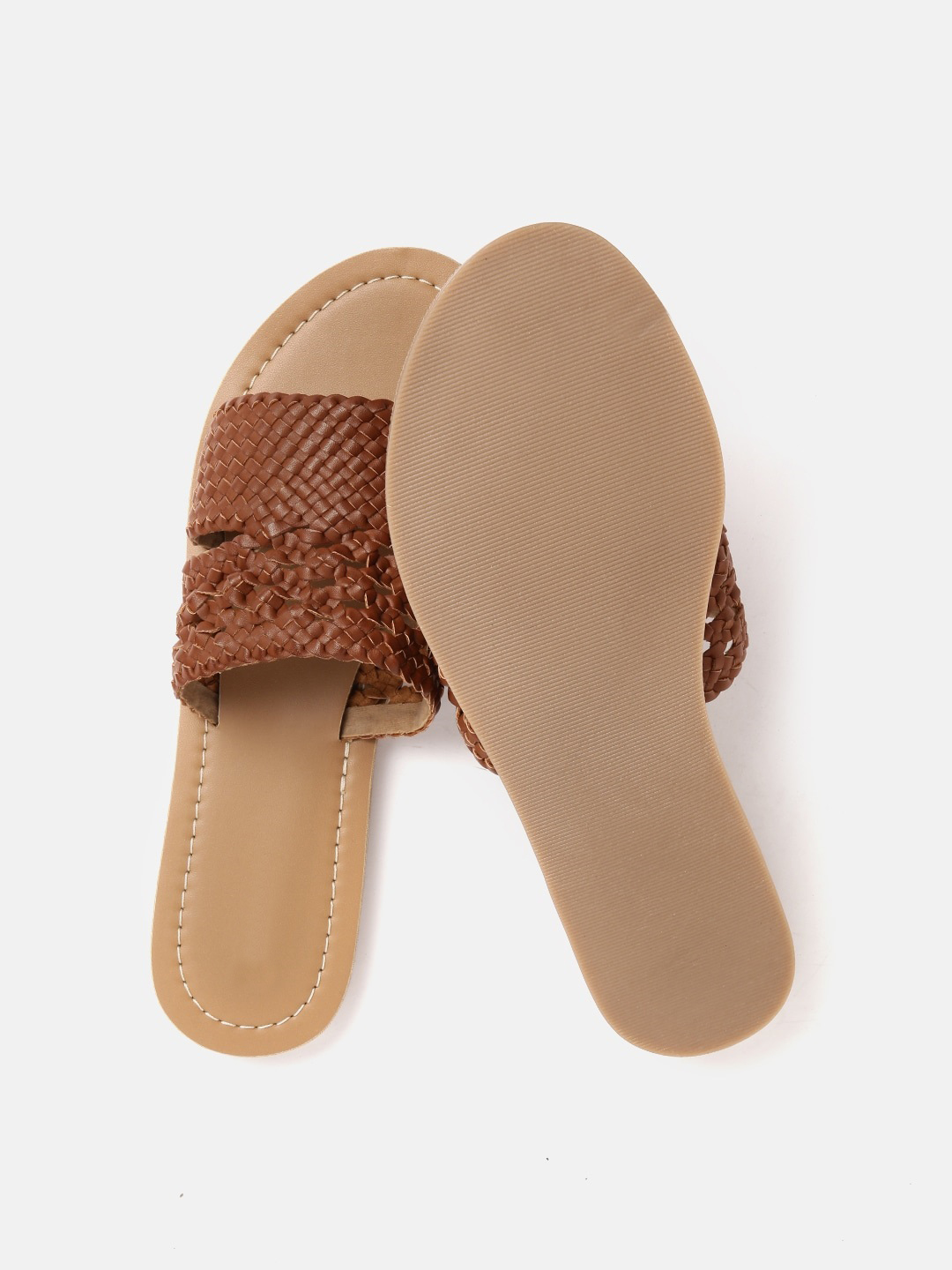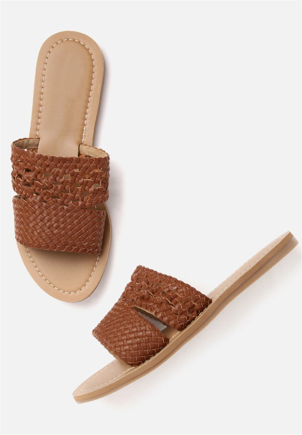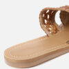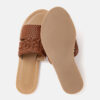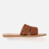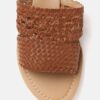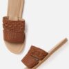 A pair of brown basket weave open toe flats, has regular styling and no backstrap detail