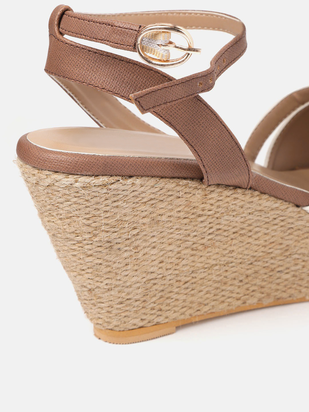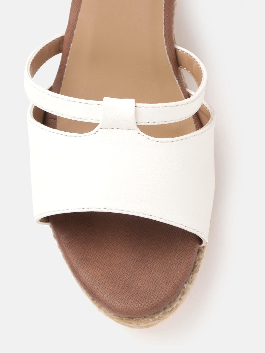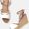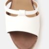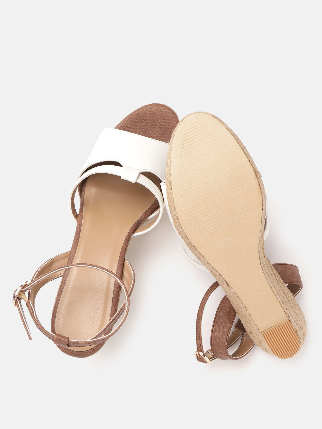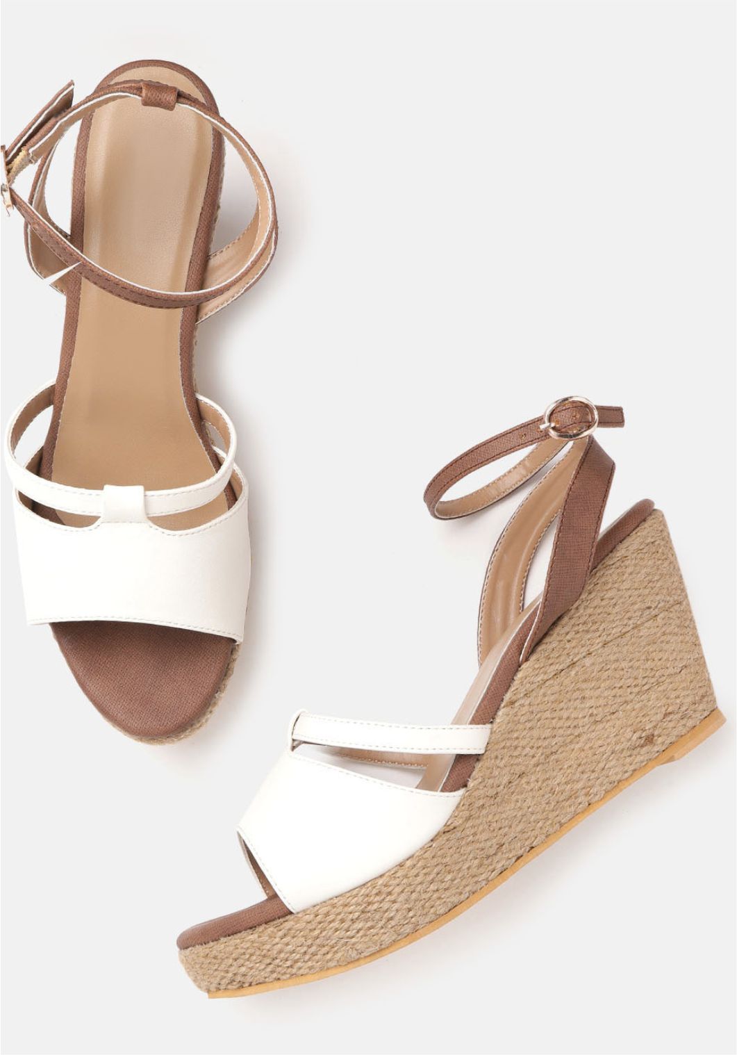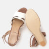A pair of white and brown open toe heels, has regular styling, ankle loop detail